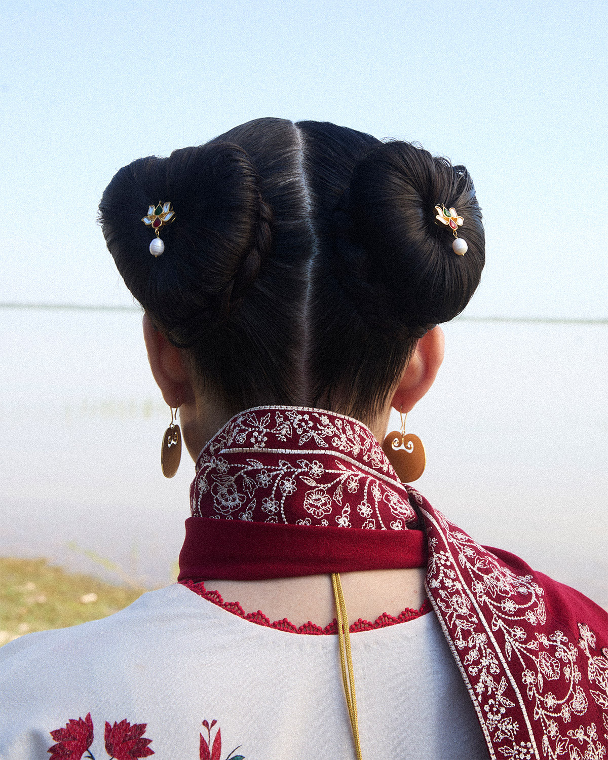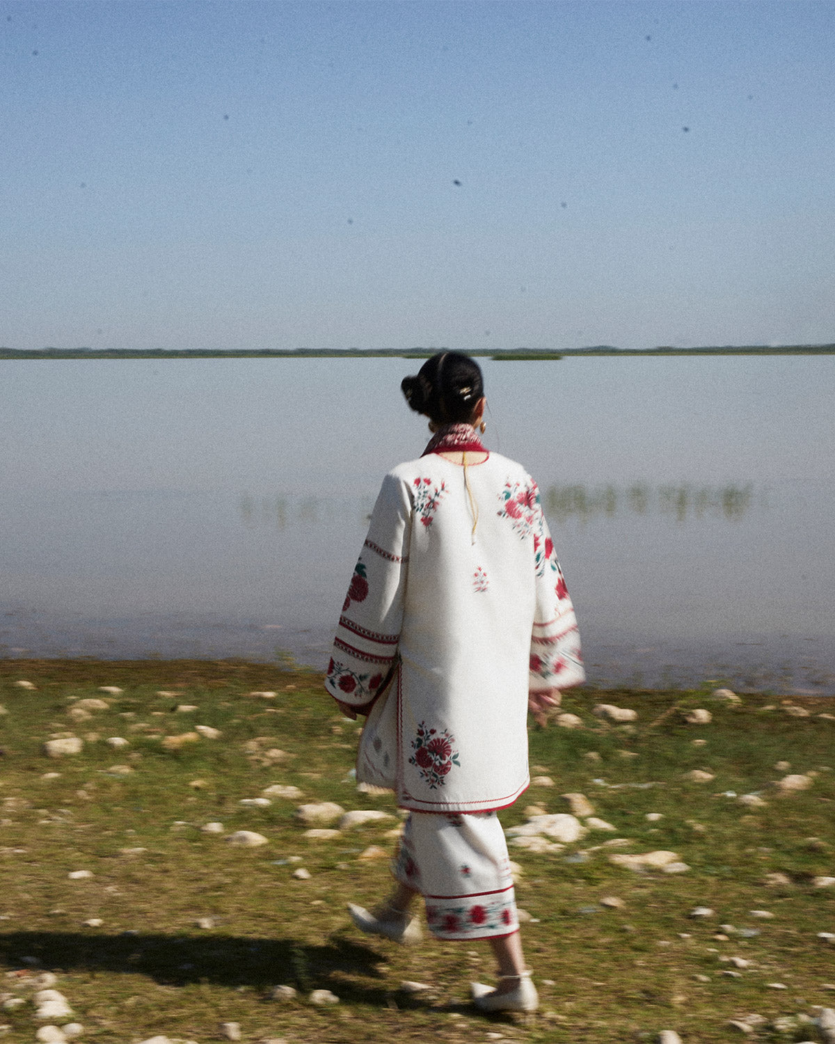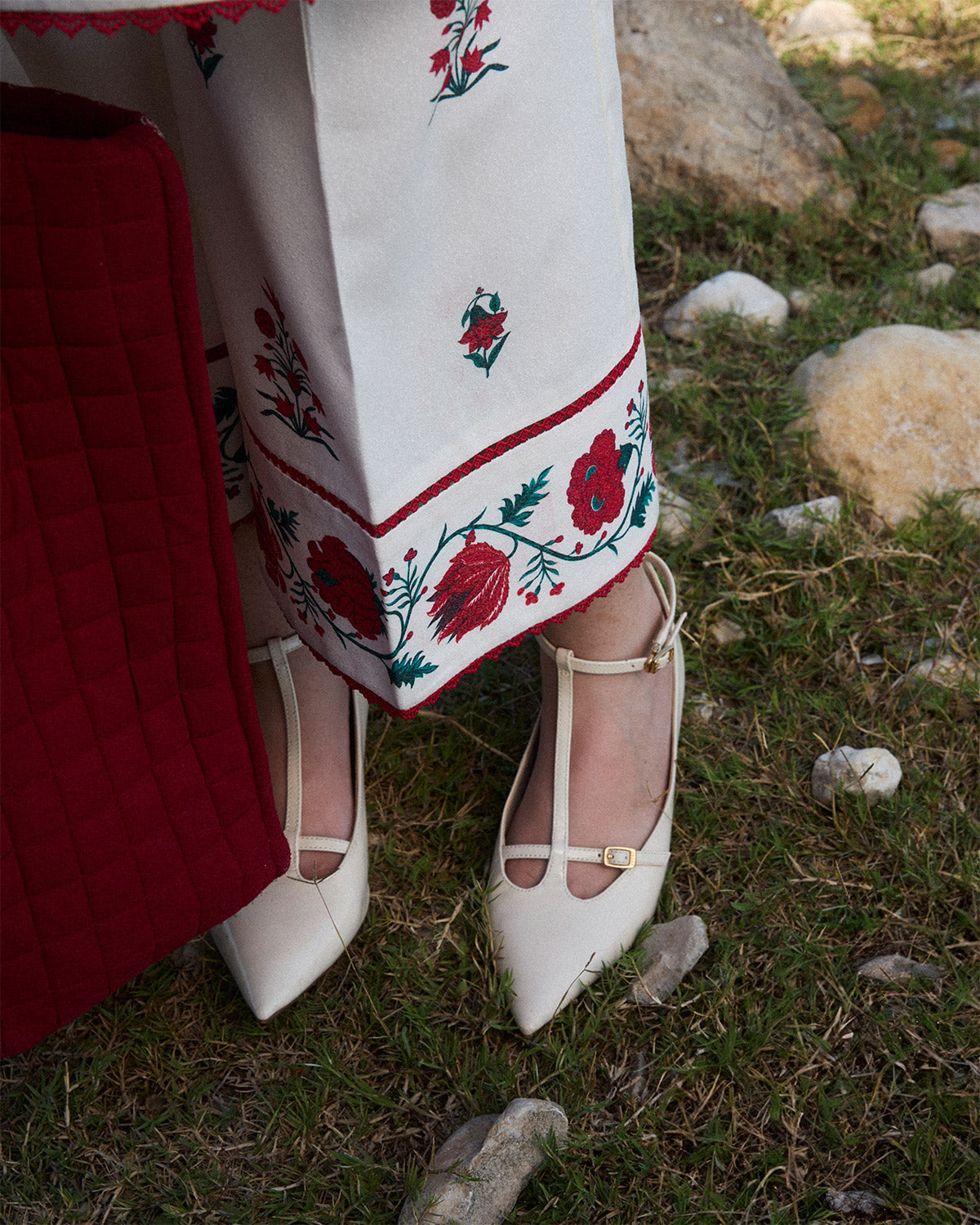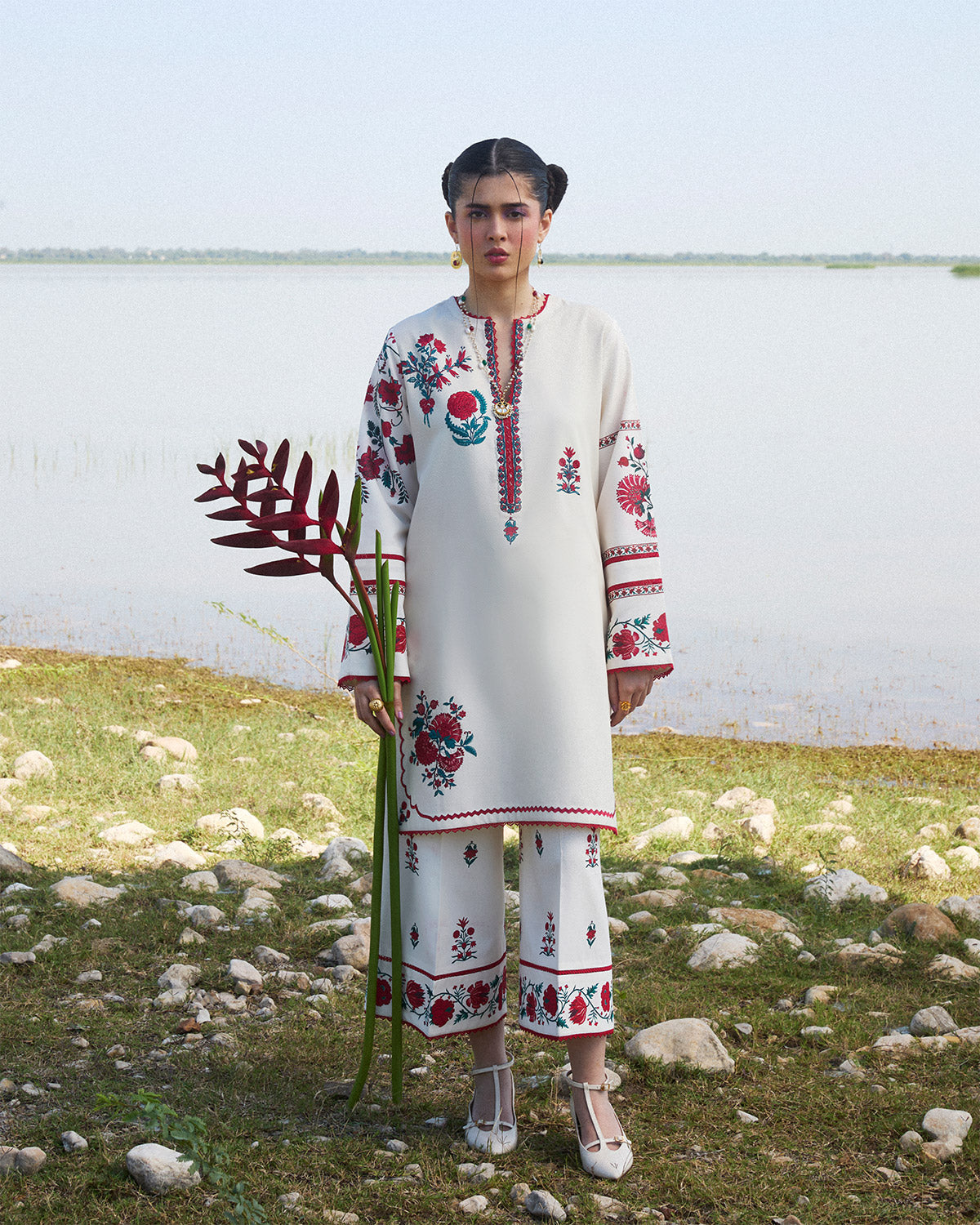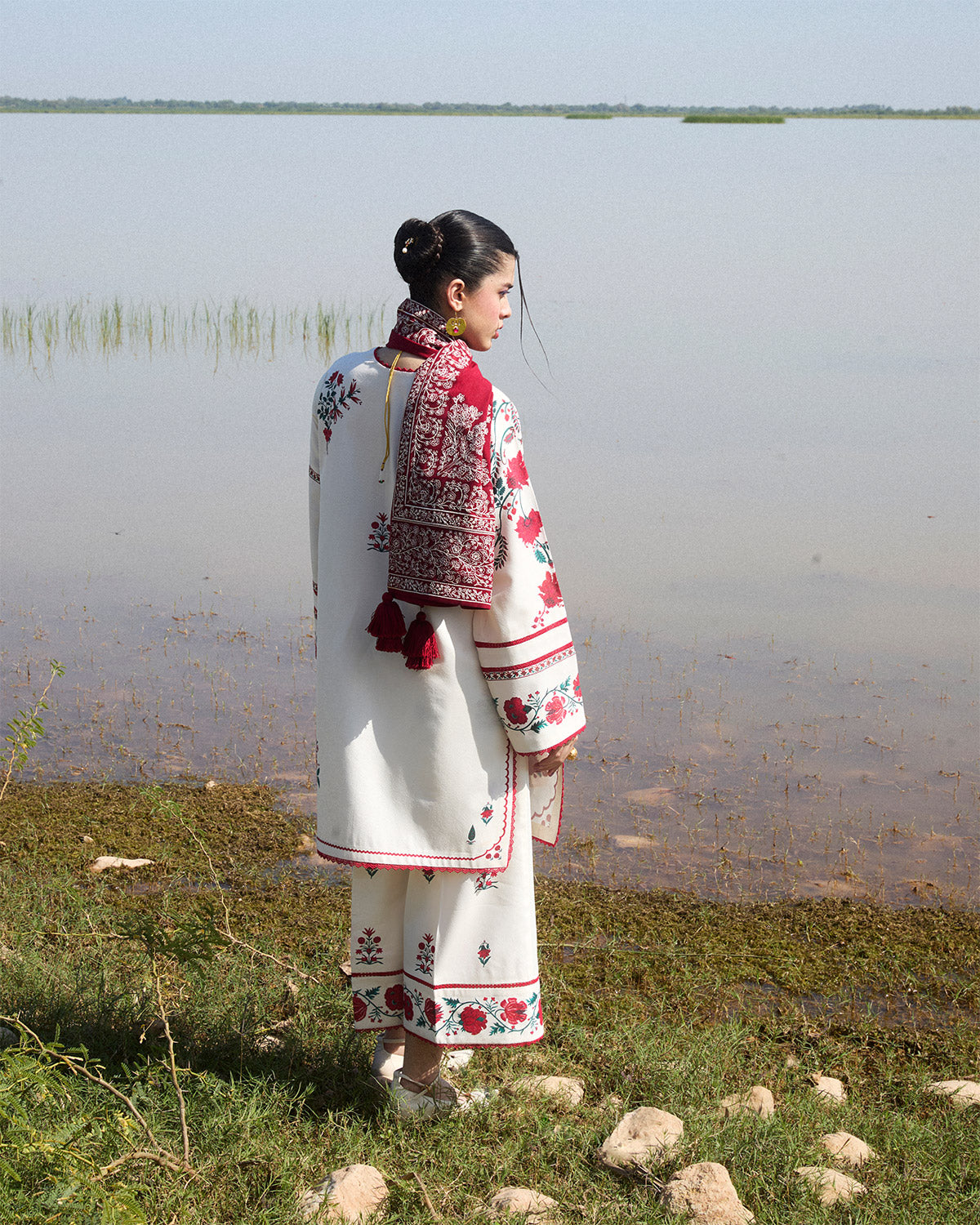 Description: This ensemble features an ivory karandi shirt adorned with delicate floral embroidery across the front, complemented by printed sleeves that add a subtle yet chic contrast. Paired with matching ivory culottes, the set brings a blend of elegance and comfort, ideal for both everyday wear and special gatherings. Completing the look is a luxurious burgundy karandi shawl, meticulously embroidered with intricate ivory detailing along all sides. The shawl’s rich hue and ornate embroidery provide a striking contrast to the soft tones of the outfit, elevating the overall look to one of effortless grace and sophistication.