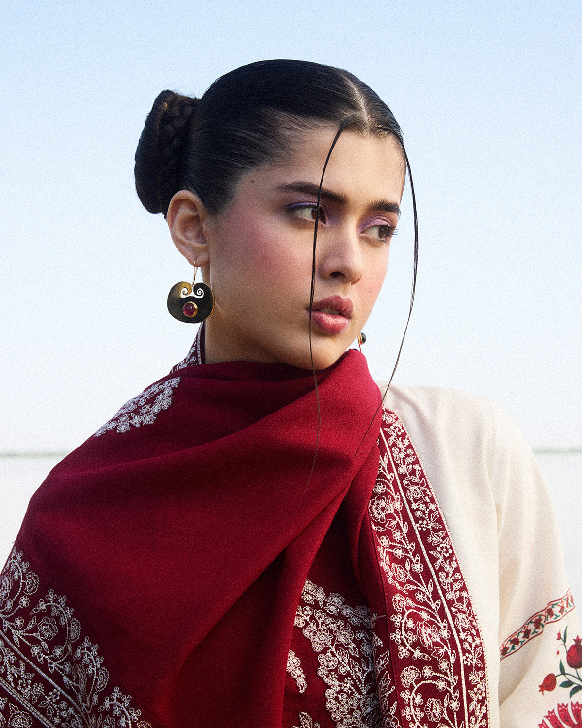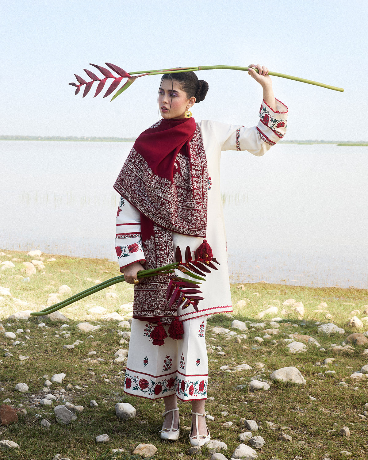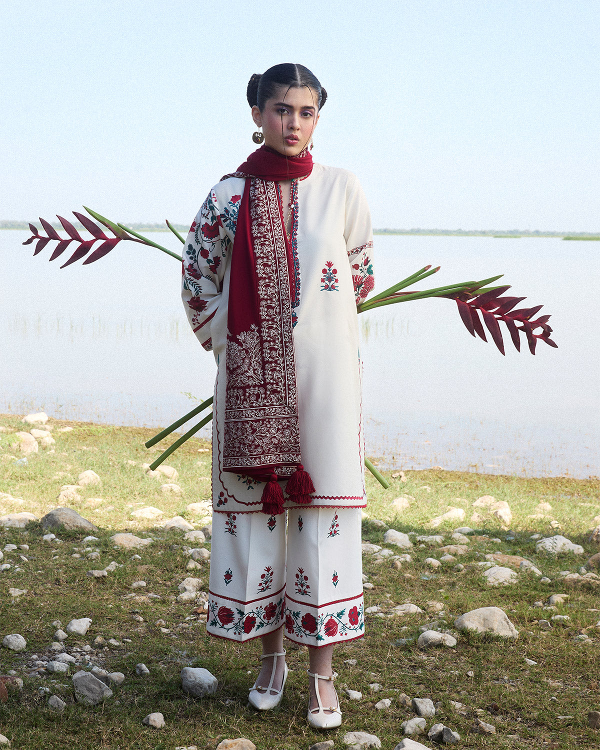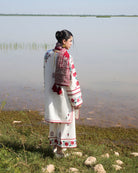 Description: This ensemble features an ivory karandi shirt adorned with delicate floral embroidery across the front, complemented by printed sleeves that add a subtle yet chic contrast. Paired with matching ivory culottes, the set brings a blend of elegance and comfort, ideal for both everyday wear and special gatherings. Completing the look is a luxurious burgundy karandi shawl, meticulously embroidered with intricate ivory detailing along all sides. The shawl’s rich hue and ornate embroidery provide a striking contrast to the soft tones of the outfit, elevating the overall look to one of effortless grace and sophistication.