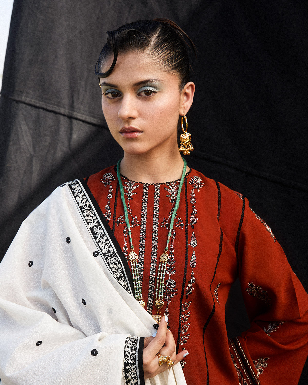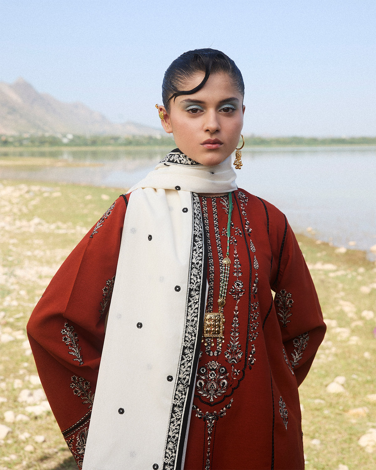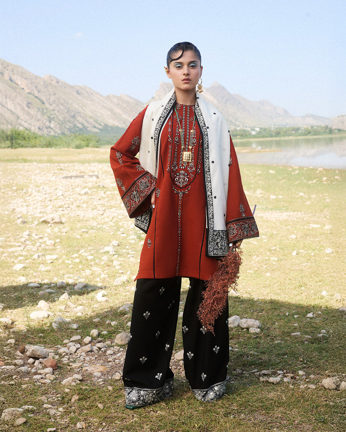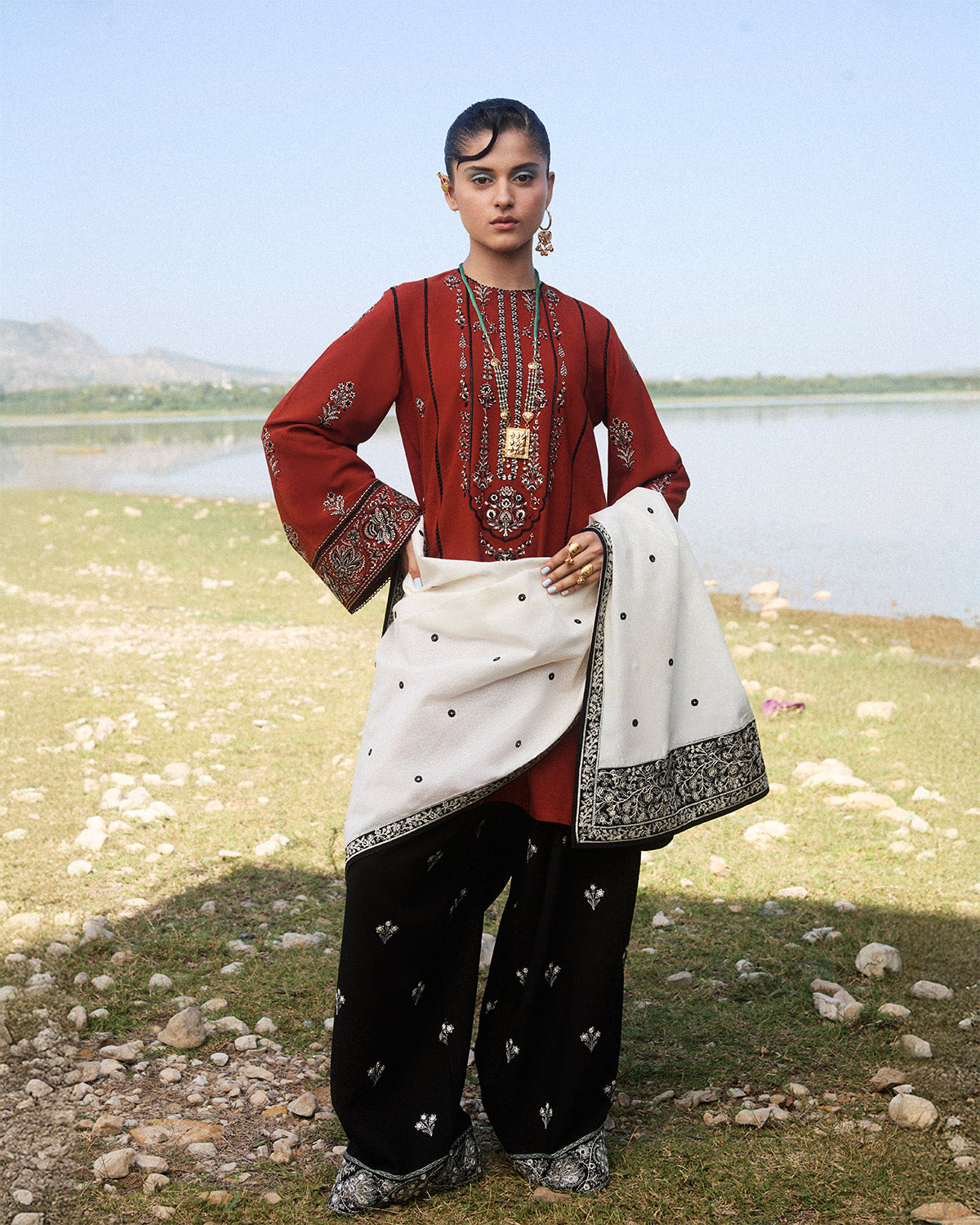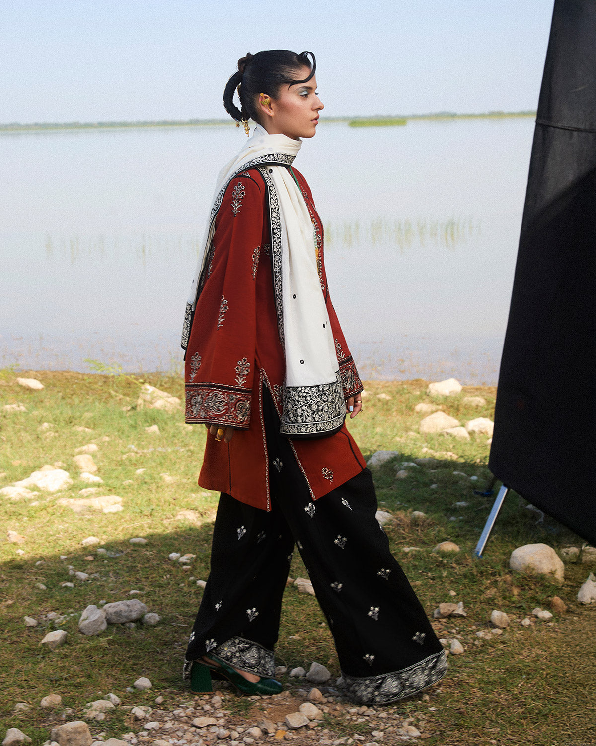 Description: This ensemble brings together rich, rustic tones and intricate traditional craftsmanship. The rust-colored panel shirt is embellished with timeless black and white embroidery, showcasing heritage-inspired patterns. Embroidered bell sleeves with delicate lace details add an elegant flair, while the classic black shalwar features traditional panni embroidery, enhancing the outfit’s cultural charm. An ivory scarf completes the look, adorned with panni embroidery that mirrors the shalwar’s detail, creating a harmonious blend of textures and colors. This outfit celebrates traditional artistry with a modern edge, perfect for those who appreciate refined, handcrafted elegance.