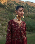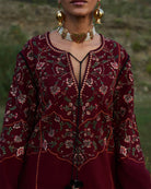 Description: This maroon-colored ensemble features a shirt with multicolored embroidered panels, highlighted by a tassel string that adds a playful yet sophisticated element. The straight sleeves, embroidered with vibrant multicolor patterns, are further enhanced with delicate lace details, offering a refined touch. Paired with a maroon shalwar, adorned with the same multicolored embroidery, this set creates a cohesive and striking look. The maroon scarf, with its intricate multicolored embroidered border and tassels, completes the outfit, adding depth and elegance. This outfit is a beautiful fusion of rich color and detailed craftsmanship, perfect for making a statement.