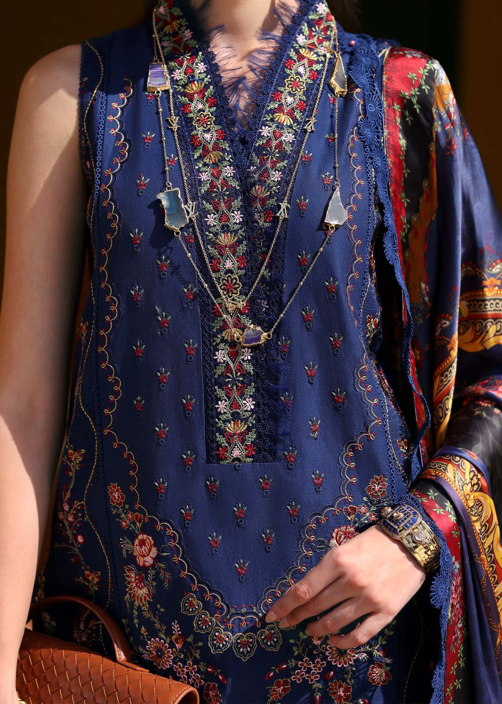 Azure is a true masterpiece of modern luxury, where the profound depths of navy blue come to life with meticulously crafted embroidery. The intricate detailing of the motifs creates a captivating texture, elevating the lawn fabric with an air of unparalleled sophistication. Every stitch exemplifies the artistry behind the design, imbuing the fabric with a timeless elegance that resonates through its intricate florals and geometric patterns. Designed with an impeccable eye for balance, this ensemble offers a seamless blend of contemporary allure and refined craftsmanship. Paired with dobby trousers, the soft yet substantial texture offers comfort while enhancing the overall opulence of the look. Completing this creation is a silk dupatta—printed with delicate patterns that gracefully drapes, offering a refined contrast and bringing a sense of couture-like artistry to the entire ensemble. This is the perfect canvas for those with an eye for detail, inviting you to curate a truly bespoke, luxurious experience.