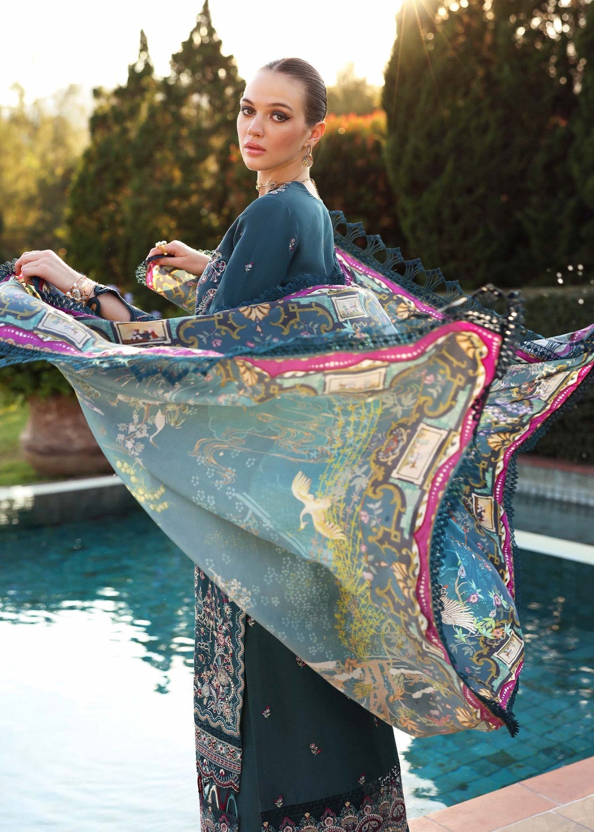 Embrace the vibrant allure of Livia, a striking teal green ensemble that effortlessly captures the essence of a breezy summer day. This light, airy lawn fabric is beautifully adorned with intricate embroidery, creating a sophisticated fusion of tradition and modernity. The front-open design enhances its chic silhouette, while the digitally printed medium silk dupatta adds a touch of fluidity and grace, featuring patterns that evoke the serene, ornate beauty of East Asian artistry. Designed for the woman who exudes confidence and poise, Livia promises a look that is both timeless and effortlessly elegant, perfect for making a statement in every season.