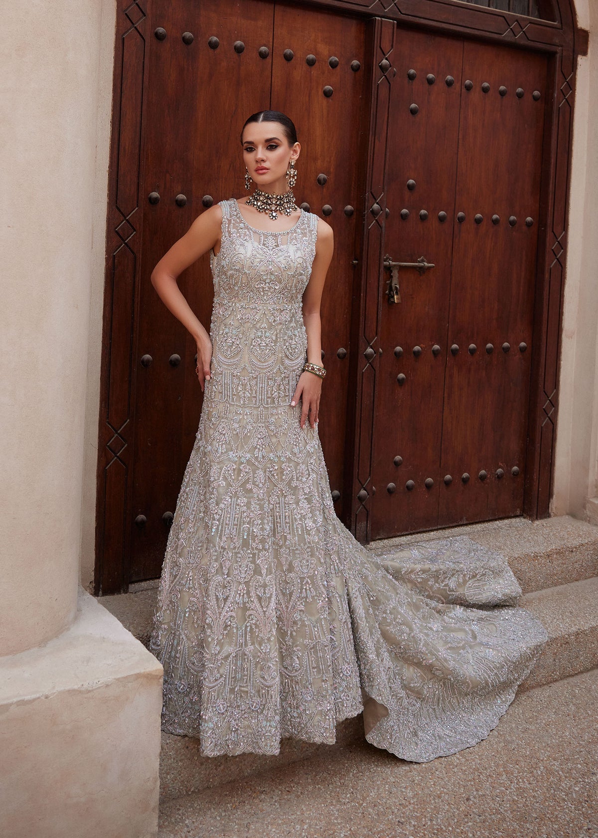 Introducing a vision of modern bridal elegance, this nude mermaid bridal dress seamlessly blends sophistication with a contemporary twist. Crafted from a soft, ethereal fabric, it embraces the body in a figure-hugging silhouette that flares out at the knee to create a stunning mermaid shape. The delicate nude hue offers a chic alternative to traditional white, exuding timeless beauty with a fresh, modern vibe. Adorned with intricate silver embellishments across the bodice and skirt, the dress sparkles subtly with every movement. The sleeveless design and intricate neckline highlight the bride’s grace, while the sheer veil, decorated with matching silver threadwork, completes the ethereal, radiant look. This bridal ensemble is perfect for the bride who wants to make a refined yet bold statement on her special day.