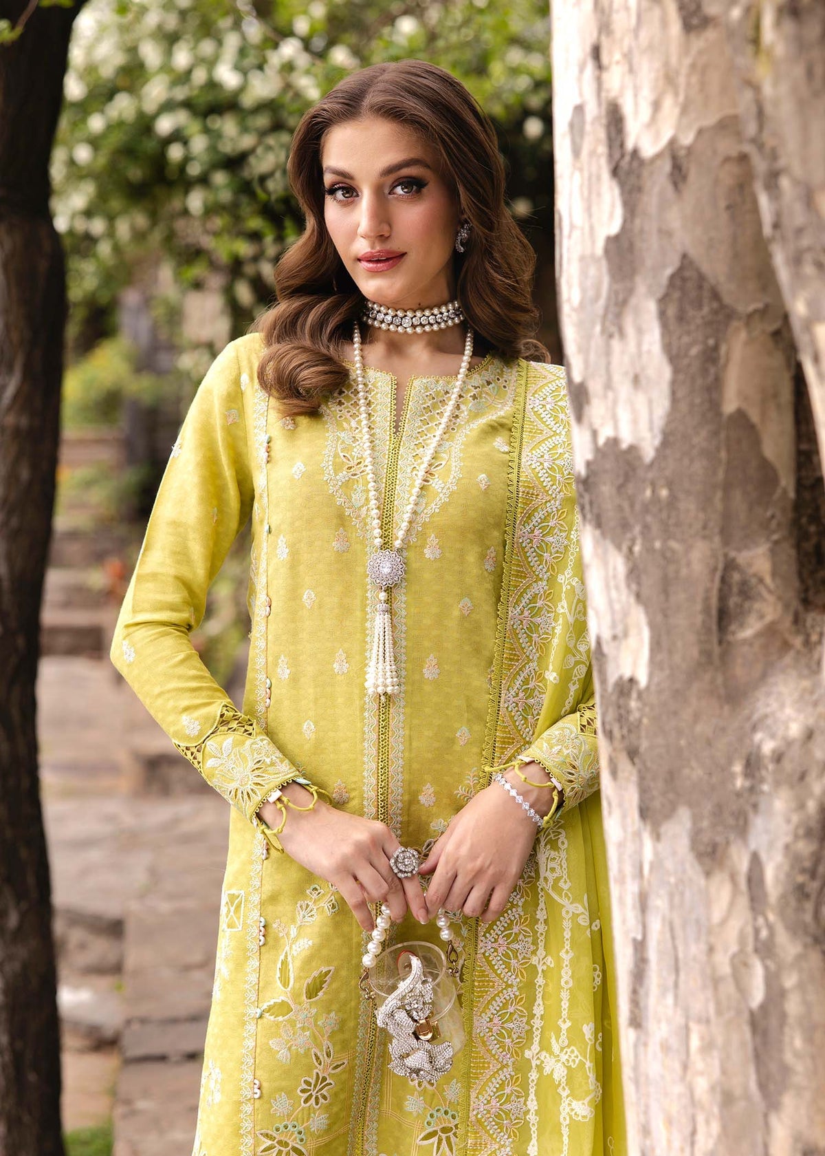 This dazzling three-piece lawn outfit in lime green is perfect for everyday elegance. This ensemble comprises of a jacquard open-shirt design with subtle, soft-toned laser embroidery on the panels, creating a delicate, textured appearance, while delicate lace detailing accentuates the shirt's silhouette. The fitted sleeves feature intricate embroidery, refined stitching, and lace accents, exuding a polished, tailored look. Paired with matching cambric cigarette pants adorned with an embroidered border and fine stitching details, offering a perfect blend of comfort and style. Completing the ensemble is a chiffon dupatta in matching lime green tones, featuring a tasteful screen print and finished with an embroidered four-sided border and lace trim, adding a light, breezy movement, making it perfect for the season. With its intricate details, elegant design, and vibrant color, this outfit is designed to bring a touch of sophistication and elegance to your everyday style, making it perfect for various occasions.