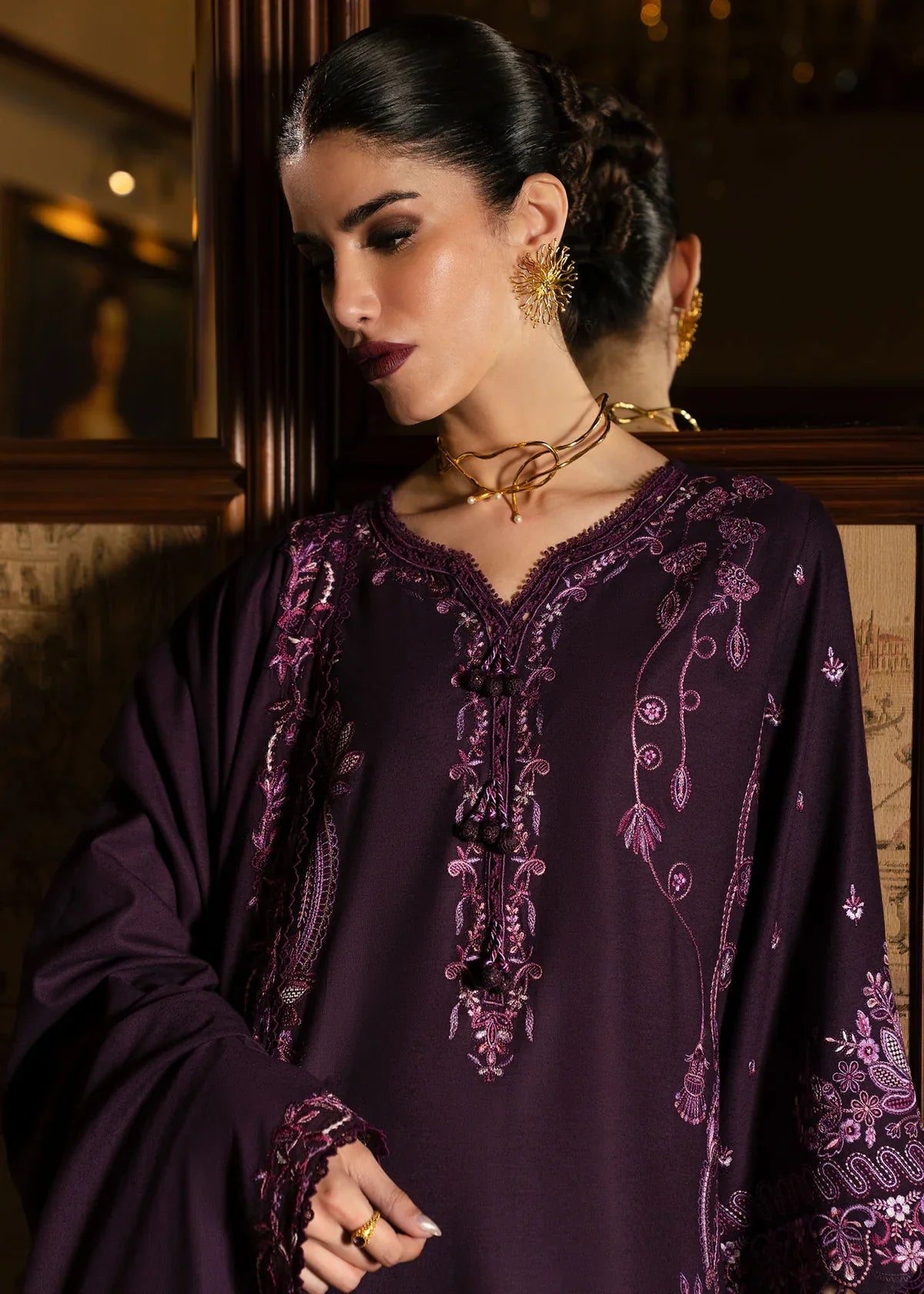 Step into effortless elegance with this rich plum karandi ensemble, featuring a short shirt with a graceful round daman, adorned with intricate self-tone embroidery for a subtle yet sophisticated appeal. The look is paired with a beautifully embroidered farshi shalwar, adding traditional charm and gentle volume to the silhouette. A coordinating karandi embroidered dupatta completes the outfit, making it an ideal choice for refined winter soirées or intimate festive gatherings.