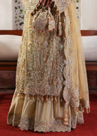 Effortlessly refined, this graceful champagne beige ensemble captures understated sophistication with a timeless allure. The design features hand-embellished net panels and refined borders, paired with intricately worked sleeves that add depth and detail. A cutwork neckline enhances the elegance, while the embroidered net dupatta with pallu detailing drapes with fluid grace. Completed with a matching trouser and a tissue inner for a delicate layered effect, the look is further elevated by colli sequin spray and artisanal adda work, creating a perfect harmony of subtle shimmer and fine craftsmanship.
