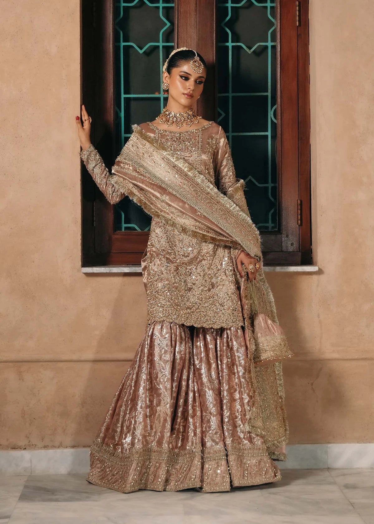 Soft, graceful, and effortlessly elegant—this Baby Pink Tissue Gharara Set is a timeless addition to your festive wardrobe. The shirt features intricate heavy embroidery, adding delicate texture and charm to the feminine hue. It’s paired with a beautifully flared gharara made from badla fabric, offering just the right touch of shimmer and movement. The look is completed with a matching tissue dupatta, light as air and subtly lustrous. Perfect for daytime festivities, dholkis, or intimate wedding events, this three-piece ensemble is all about understated luxury in a dreamy pastel palette.