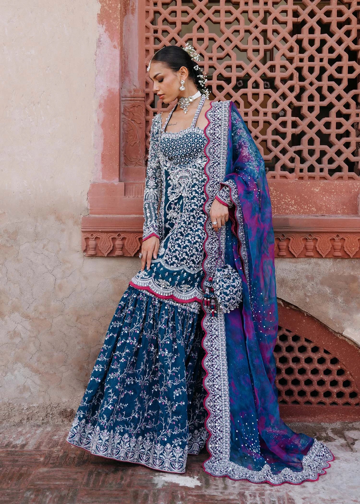 Exuding regal elegance, this organza ensemble is a masterpiece of artistry and detail. The shirt features intricately embroidered panels and an elongated neckline, layered over a fully embellished bustier that adds depth and grandeur. Colored charmeuse piping accents the design with a subtle pop, while the tie-dye dupatta, adorned with an ada spray and finished with heavily scalloped borders, lends a touch of modern charm. Completing the look, the traditional gharara showcases an elaborate jaal at the hem with a delicate spray above the gota, creating a harmonious balance of tradition and sophistication.