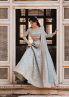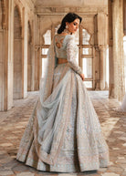 A vision of refined elegance, this powder blue lehenga choli is crafted from sumptuous tissue fabric and enhanced with a striking interplay of pattis for an artistic finish. The lehenga and choli feature richly embroidered borders and exquisite ada work, showcasing masterful craftsmanship. Paired with a soft net dupatta, delicately hand-embellished throughout, this ensemble is a timeless choice for weddings and grand celebrations.