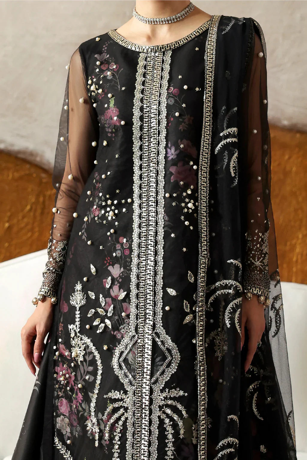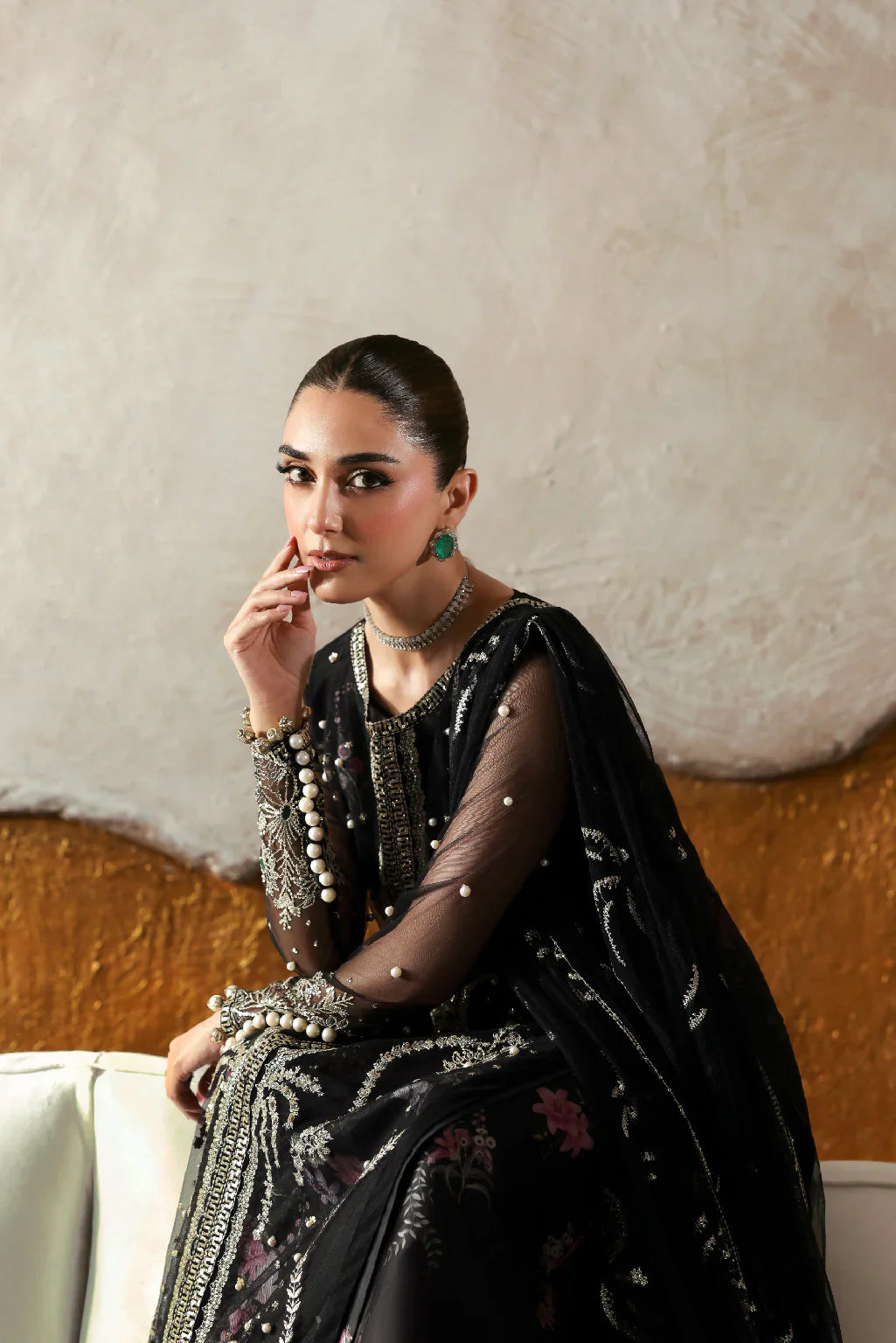 A striking black net ensemble adorned with intricate silver embroidery and hand embellished, paired with printed floral lehanga. The long flared silhouette paired with a matching embellished dupatta creates an elegant and regal statement.