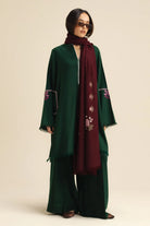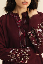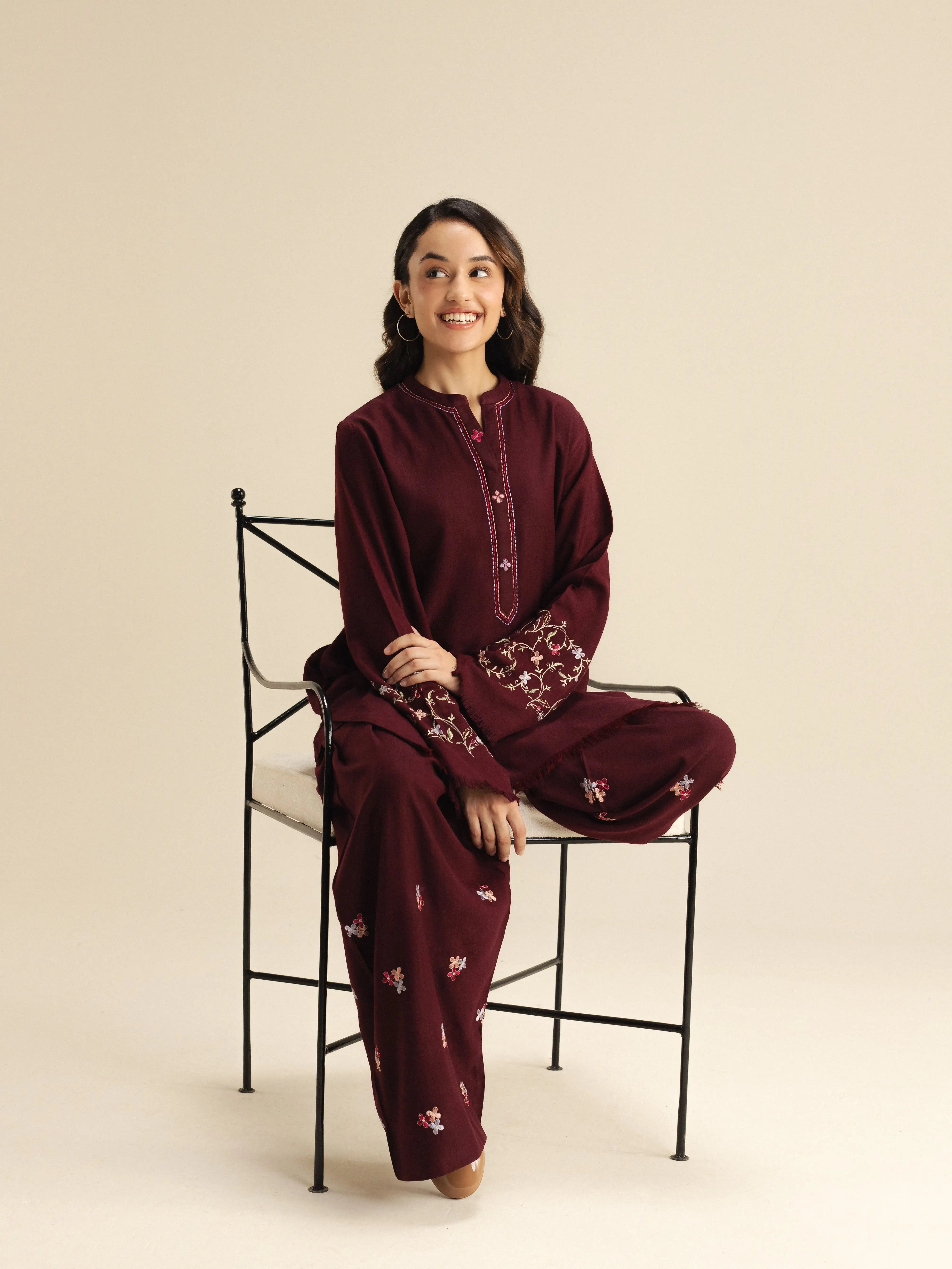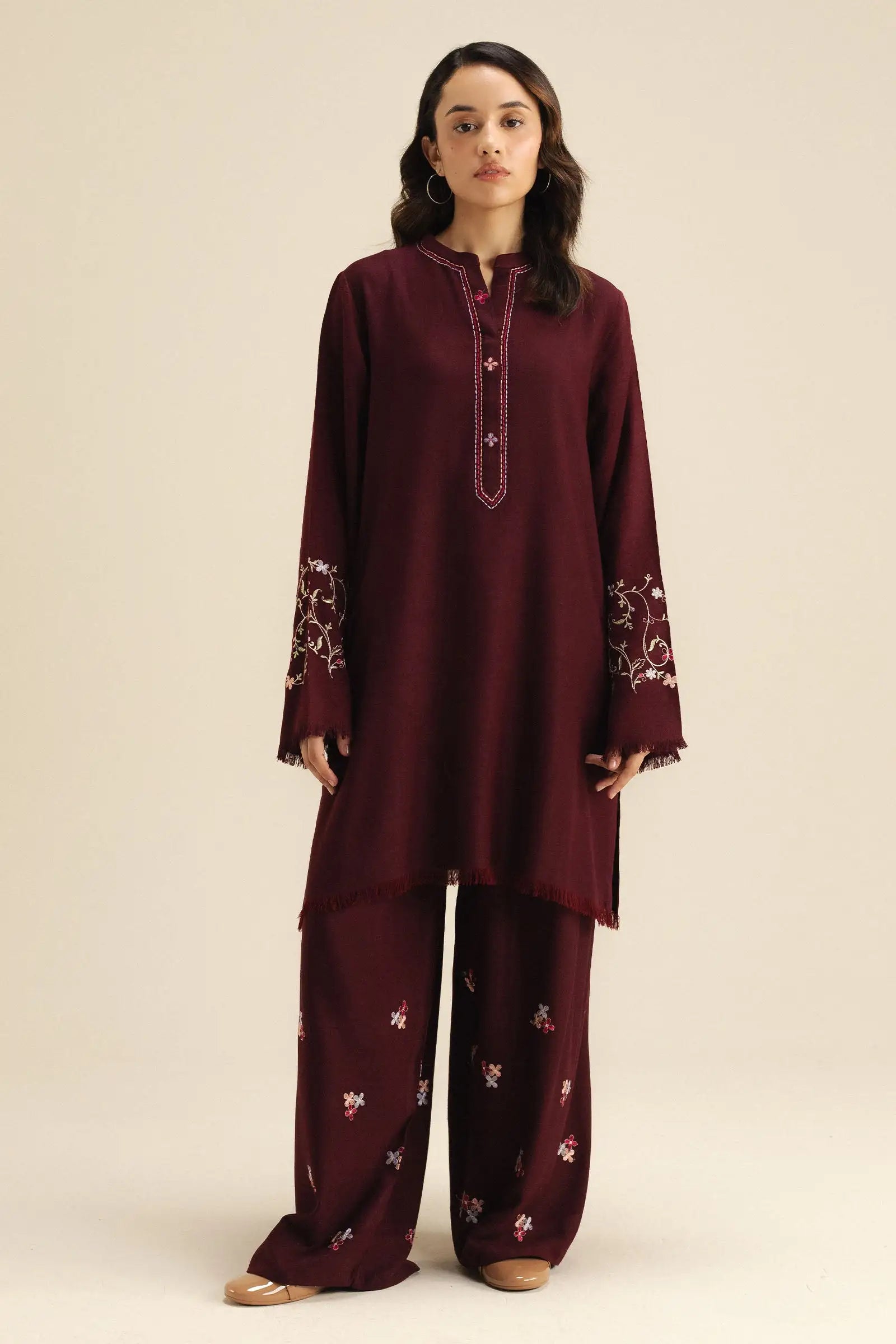 A rich burgundy wool peach short shirt detailed with intricate floral embroidery on the sleeves and neckline, paired with a farshi shalwar featuring matching floral motifs.