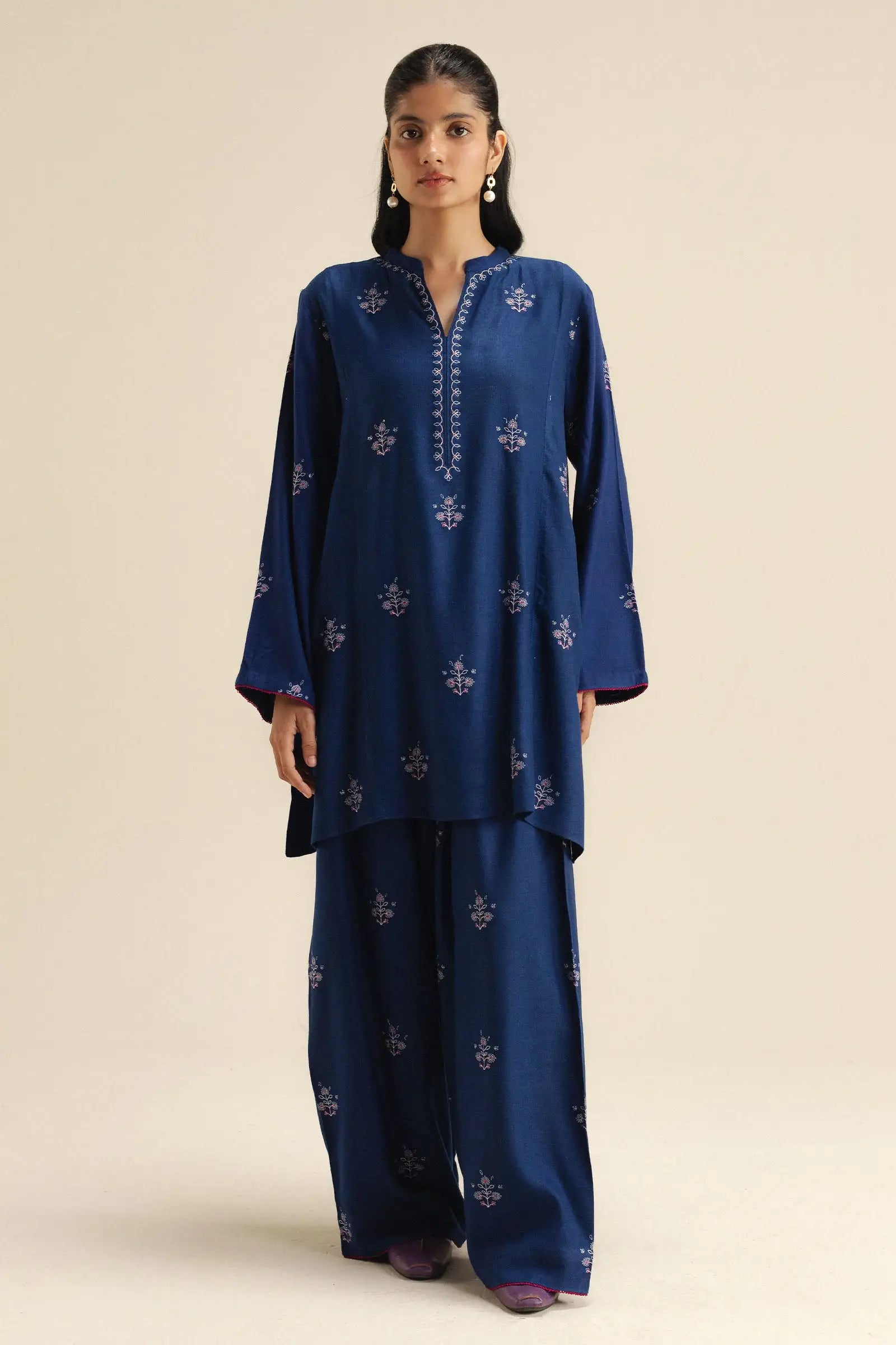 A deep blue wool peach outfit featuring delicate embroidery, paired with a farshi shalwar and finished with marganta lace detailing for an elegant finish.