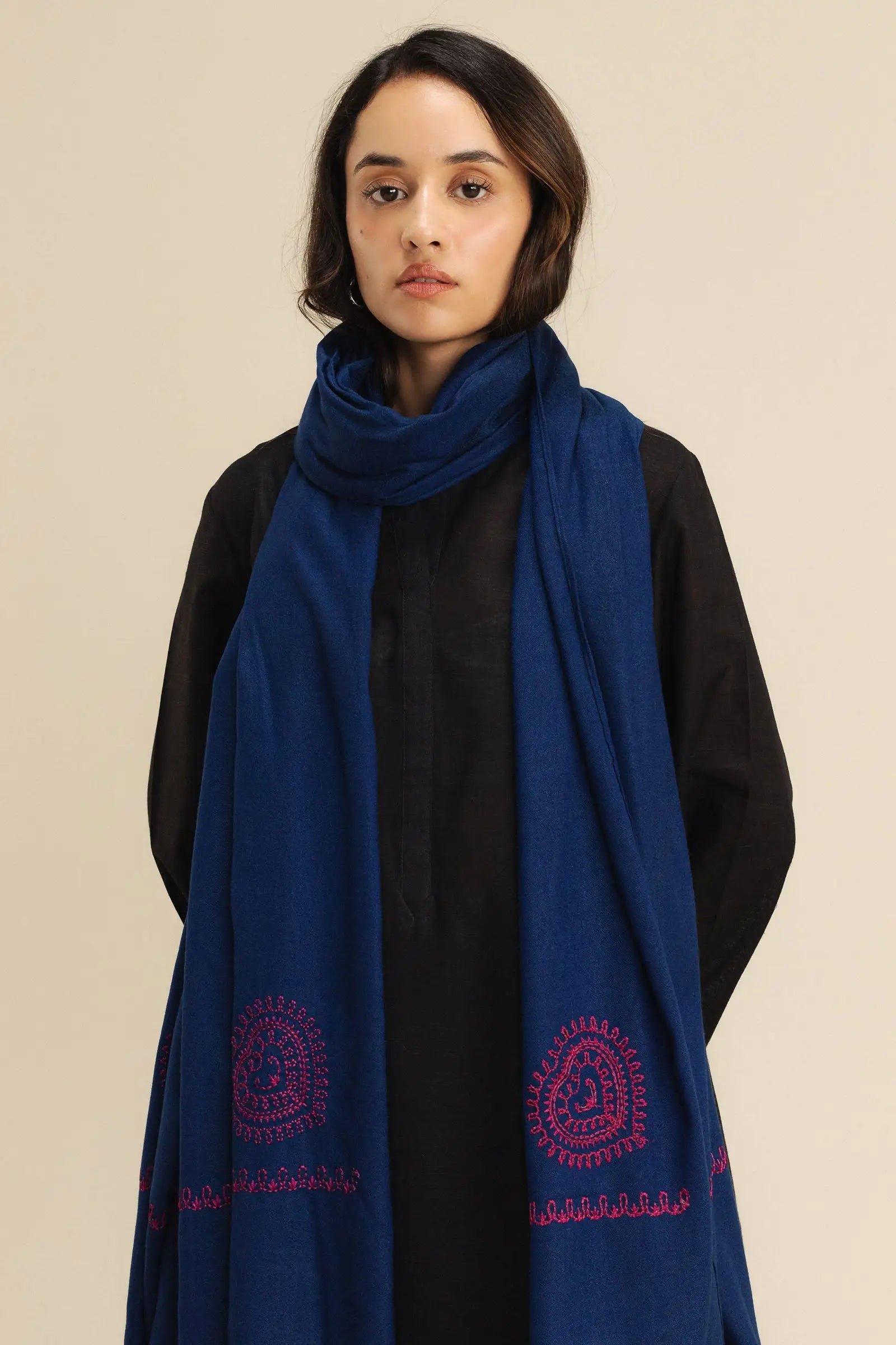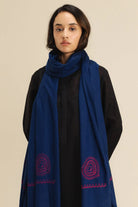 A blue wool peach shawl adorned with intricate magenta embroidery on the pallu, perfect for elevating any look.