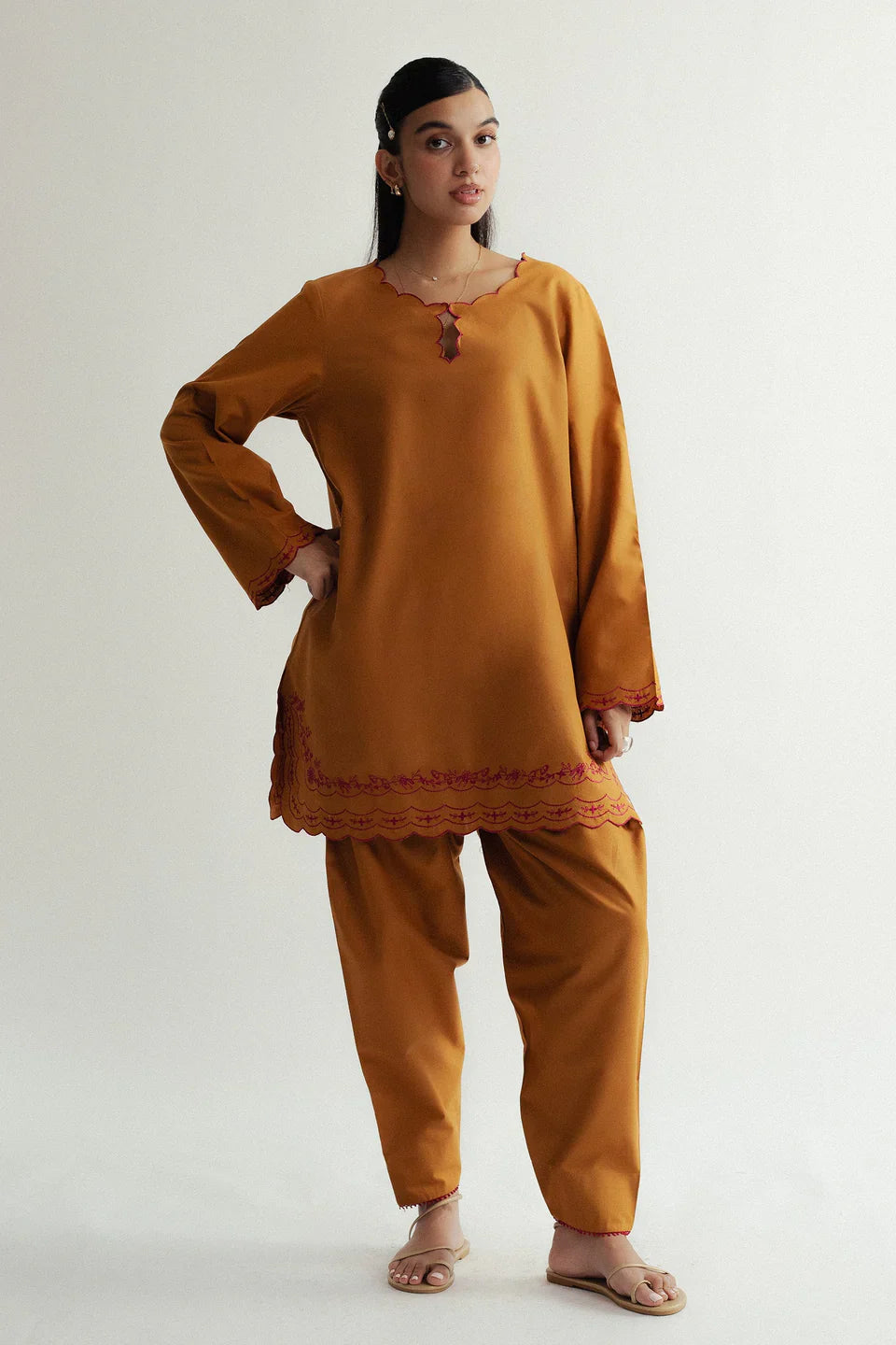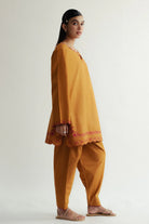 Fabric: KarandiA mustard kurta with contrasting scalloped embroidery, styled with a tapered shalwar for a chic everyday look