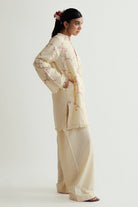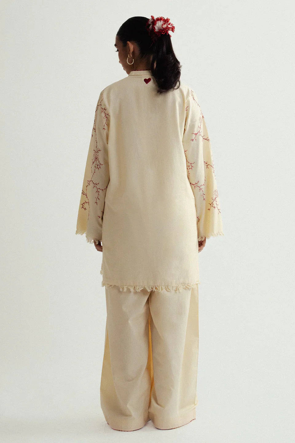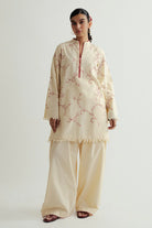 Fabric: KarandiAn ivory kurta with contrasting jaal embroidery all over, paired with a farshi shalwar for a classic yet striking look.
