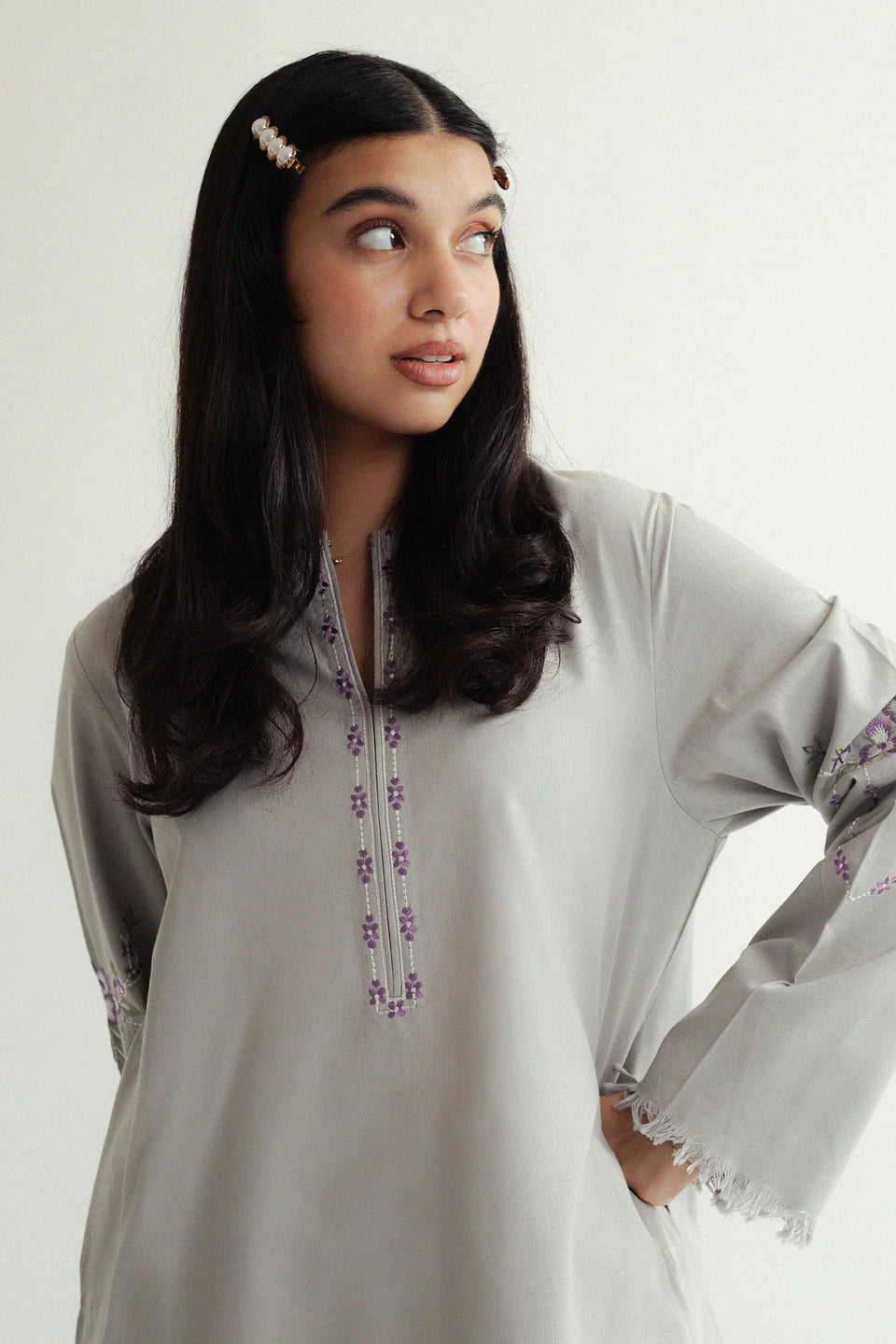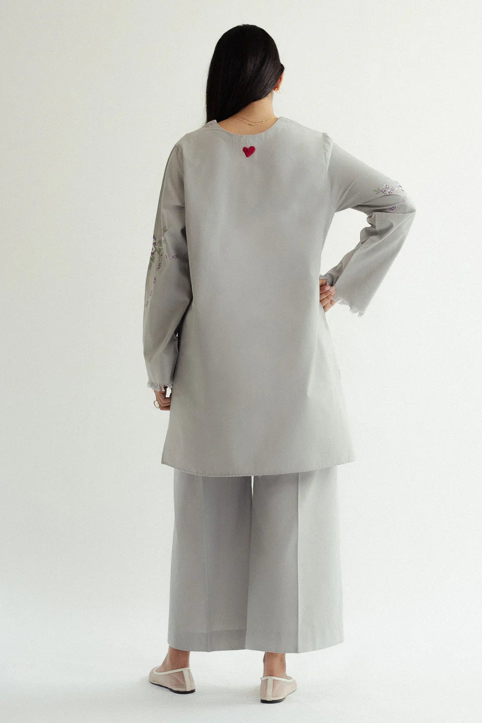 A soft grey shirt paired with wide-hem trousers, highlighted by delicate embroidery along the neckline and sleeves for a subtle yet refined finish.