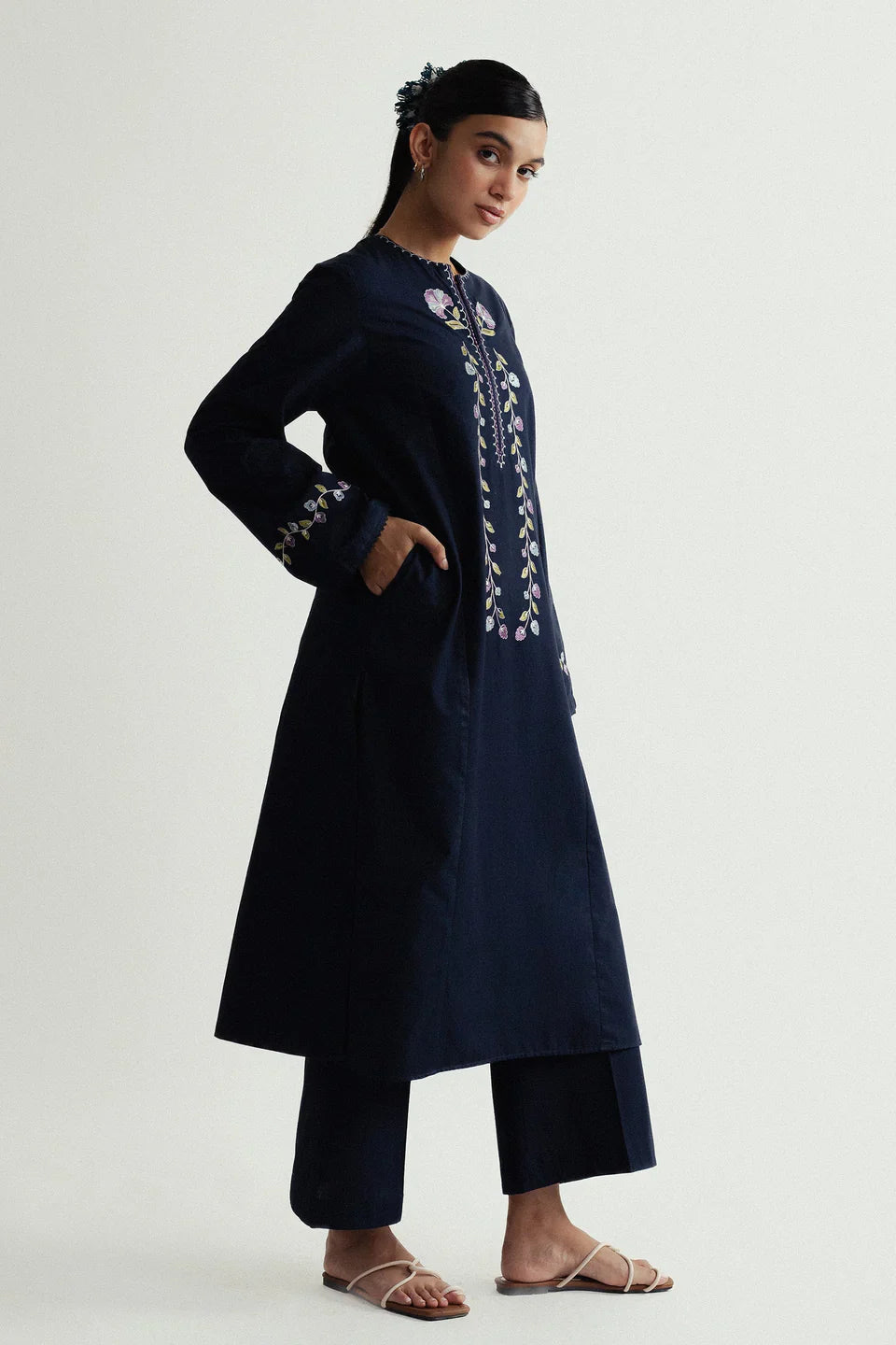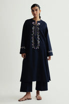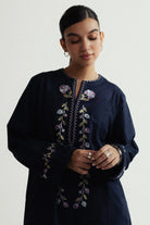 A long navy blue shirt paired with cropped pants, detailed with delicate floral embroidery on the neckline and sleeves for an elegant finish