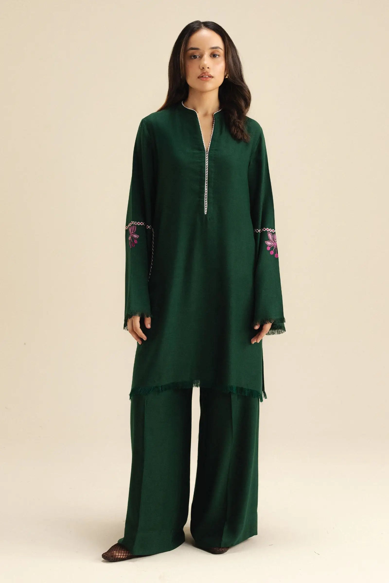 A deep green ensemble with a sleek short kurta adorned with embroidery on the sleeves and pockets, paired with wide-leg trousers for a graceful, modern look.