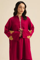 A dark pink wool peach outfit featuring delicate sleeve motifs and lace detailing on the neckline, paired with a farshi shalwar for a soft, feminine look.