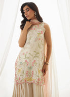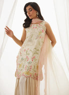 Paired with wide leg pleated pants and a diaphanous dupatta in pastel shades, the look captures a timeless femininity with effortless grace.