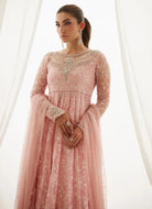 A dreamy kalidar in delicate organza, brought to life with pearls, sequins, and Swarovski crystals painstakingly hand embellished alongside intricate nakshi and silk thread accents.