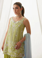 A zingy lime green ensemble that blends tradition with contemporary cool — a richly embroidered shirt, cut from pure raw silk, paired with fluid draped pants and a soft chiffon dupatta edged in lace.