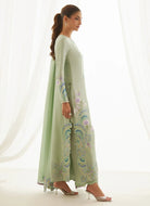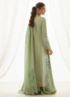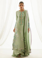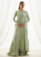 Embroidery in pale blue and lavender hues adds depth, while hand-embellished accents and delicate buttons bring artisanal finesse. Paired with pleated dhaka pants and a fluid medium silk dupatta, it’s a look that blends contemporary refinement with eternal glamour.