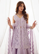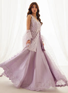 A delicate interplay of lavender and silver — this front-open raw silk shirt features scalloped cutwork borders, adorned with pearls and 3D florals for a touch of romance.