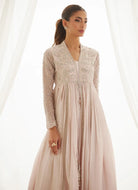 Cut from pure raw silk in a pale blush pink, the flowing silhouette is brought to life with delicate coordinating threadwork and silver, pearl, and bead embellishments. The intricately handworked bodice is designed to command attention, making it the ultimate statement for day or night. Paired with a striking lehenga, this fail-safe ensemble promises to make you the belle of the ball.