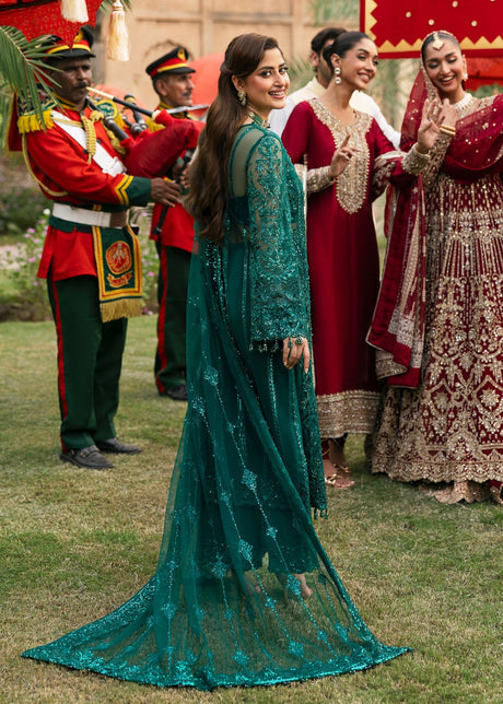 Dazzle in this stunning emerald ensemble, a true masterpiece crafted from delicate net and adorned with exquisite embroidery and hand embellishments. The design showcases an artistic fusion of ethnic elements, highlighted by shimmering green sequins that infuse vibrancy and allure. A richly embellished border elevates the look to new heights, while the elaborately embroidered net dupatta and matching trousers exude luxury and sophistication. Perfect for any special occasion, this outfit harmoniously balances tradition and contemporary style, ensuring you make an unforgettable impression wherever you go.