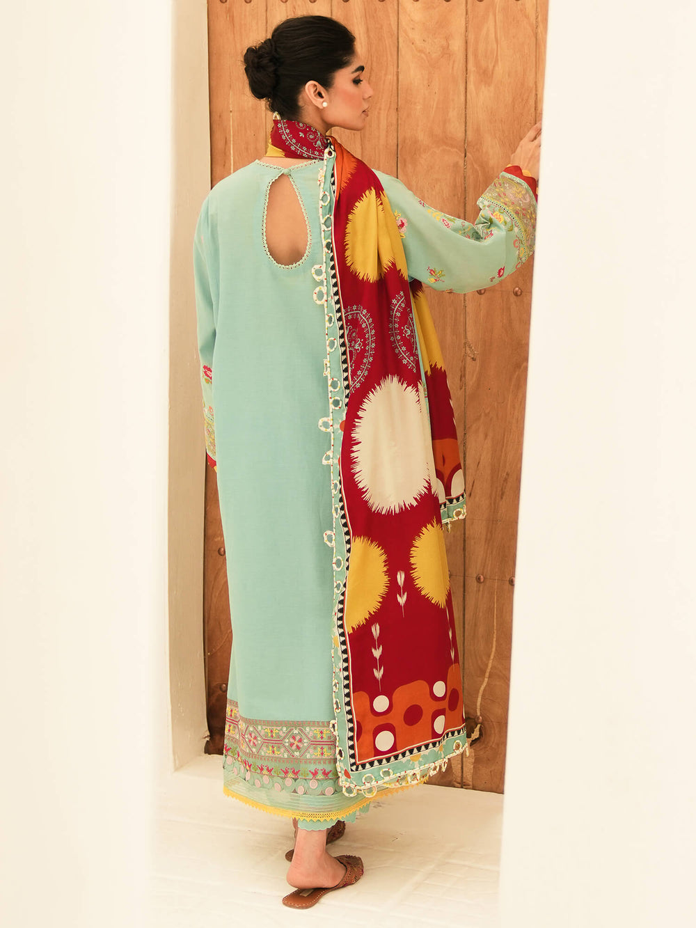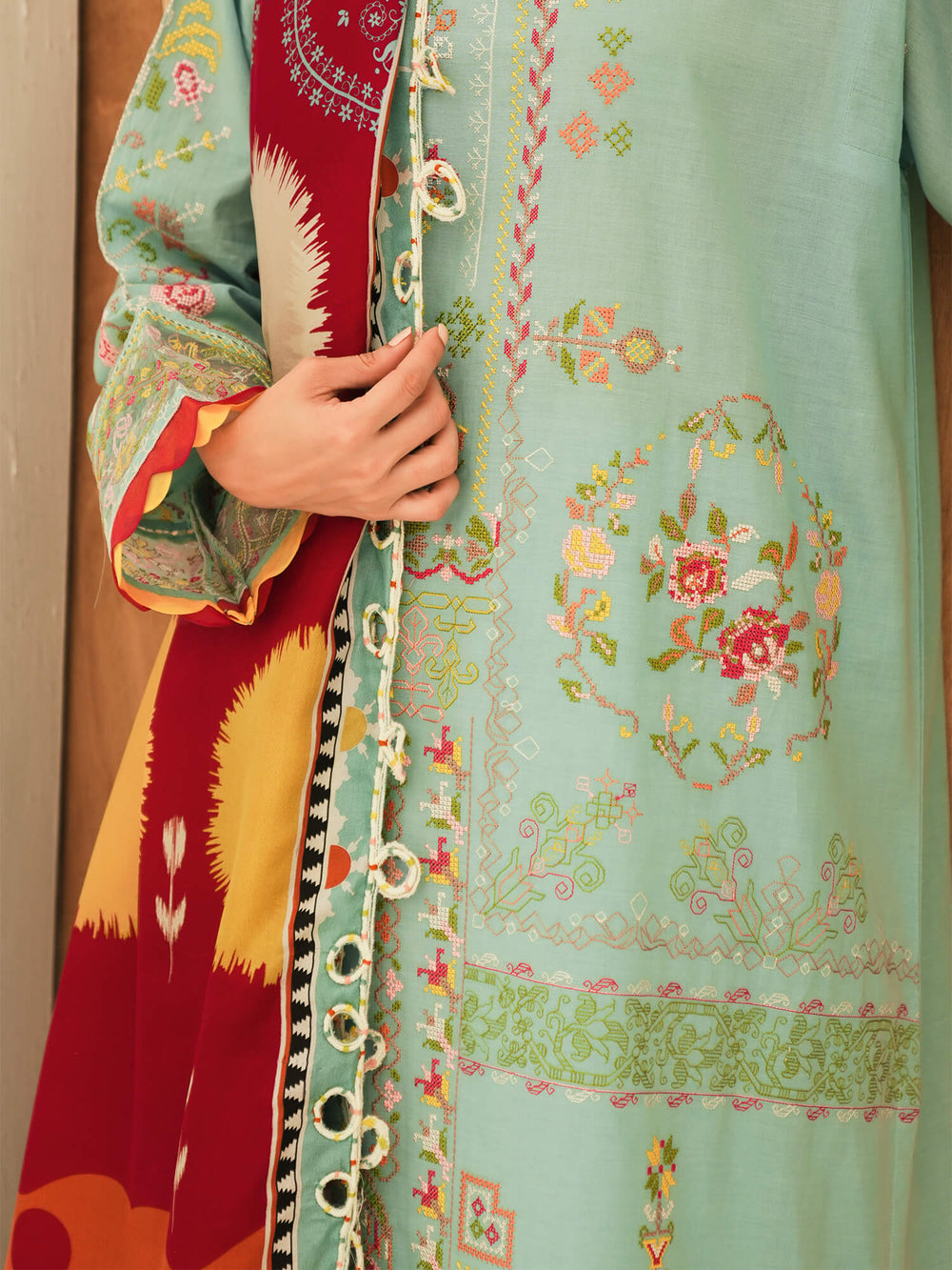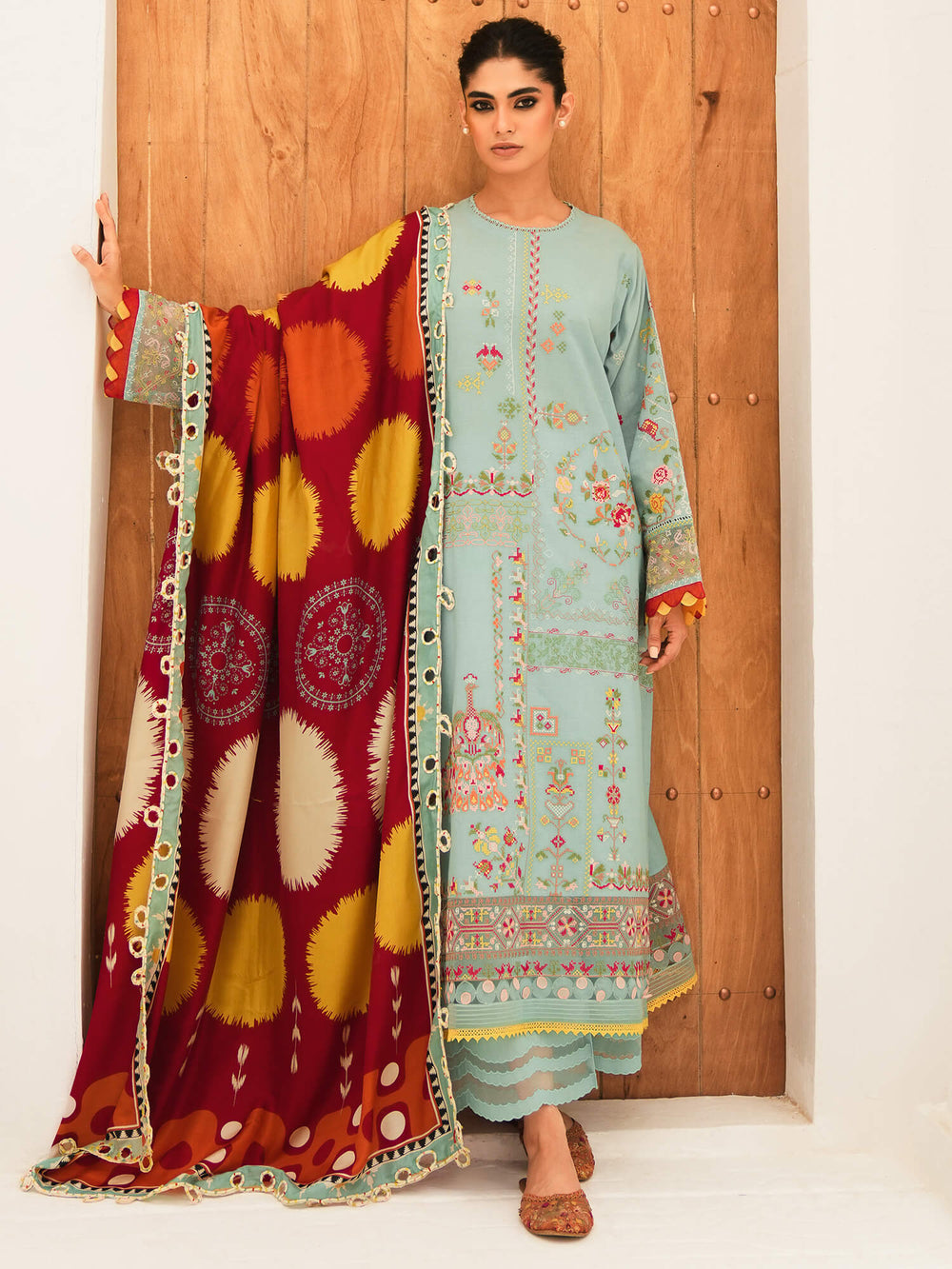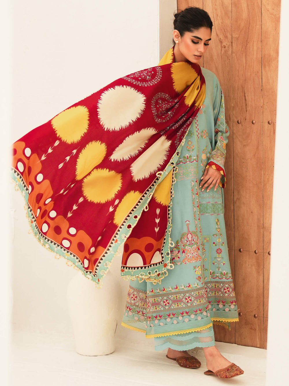 “Alayna” is ideal for your spring summer wardrobe. Crafted from a aqua base with fine cross stitch embroidery and is paired with a striking Ikat-style silk dupatta and matching pants.