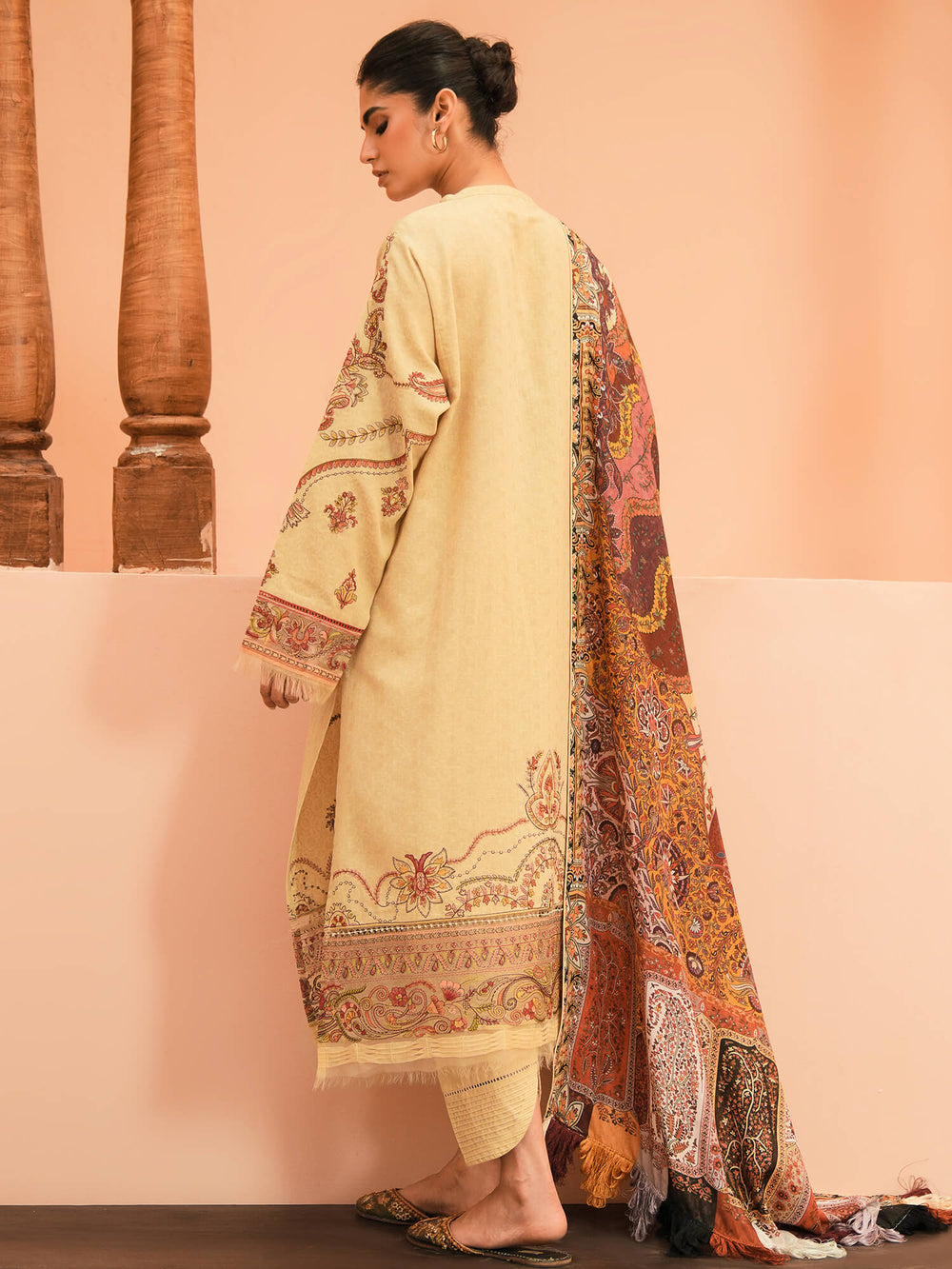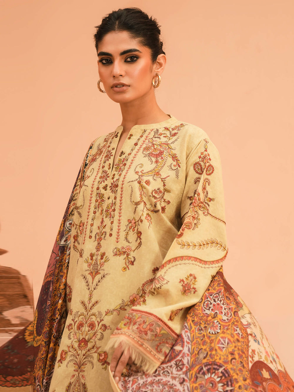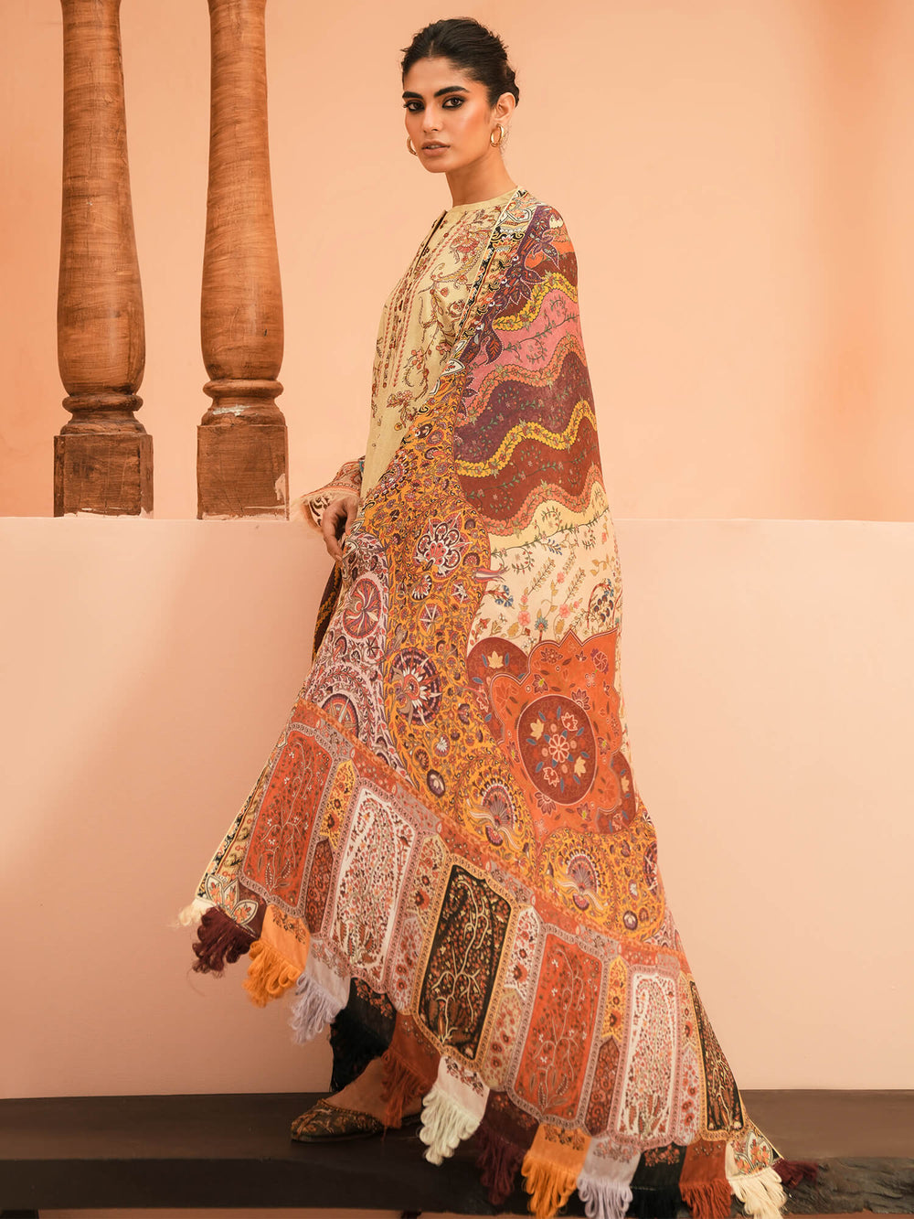 A timeless classic. Inspired by Kashmiri paisleys, “Amaya” features fine embroidery on a sand base in contrasting hues of brown, ecru and orange. Paired with a beautiful colour. blocked silk dupatta and matching pants.