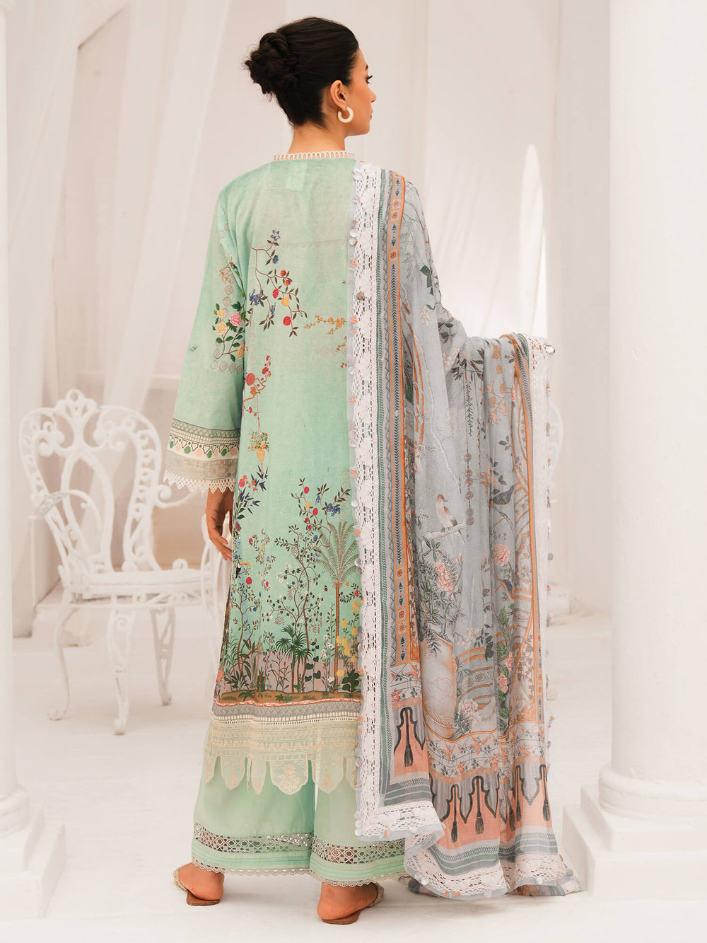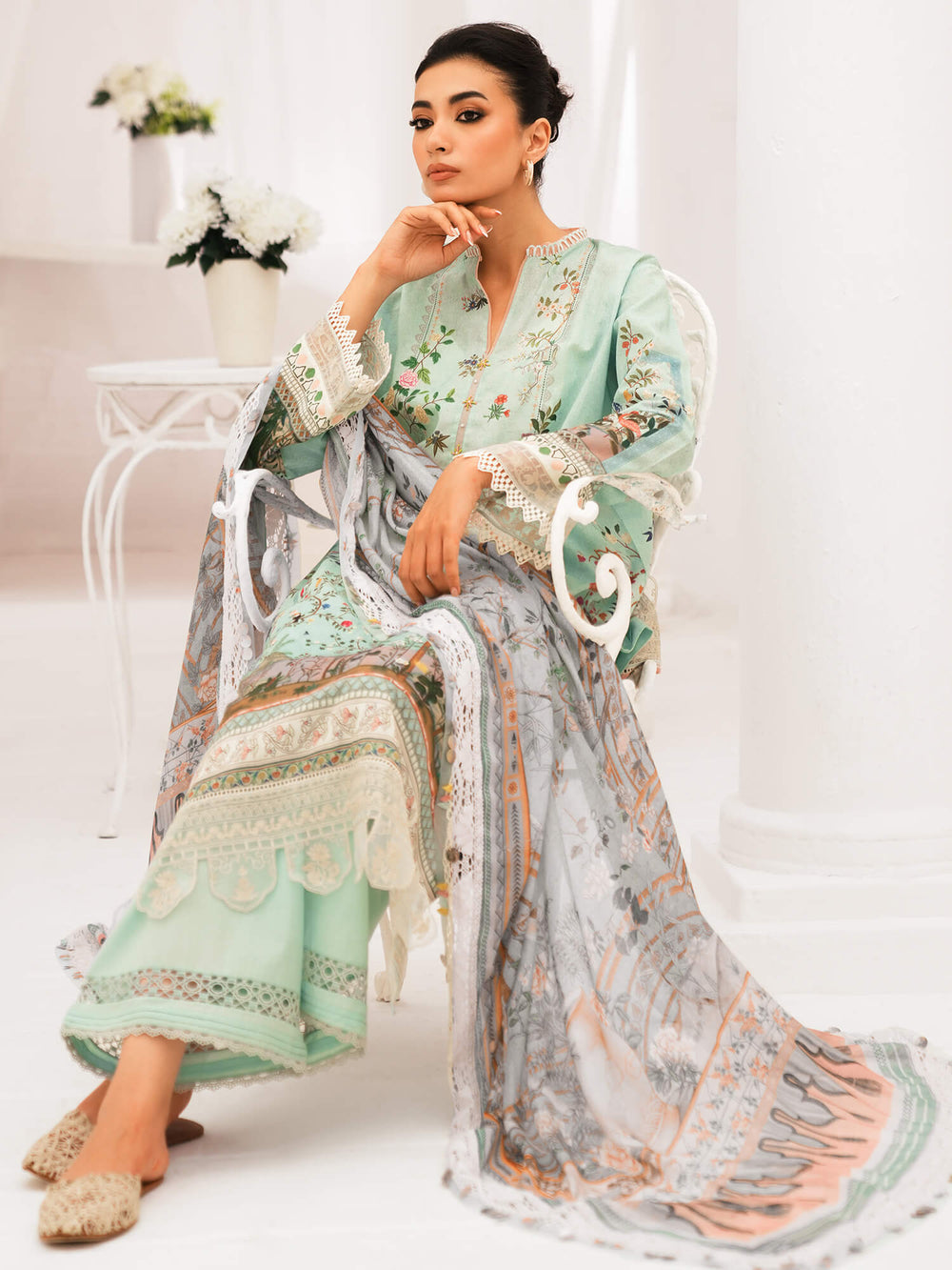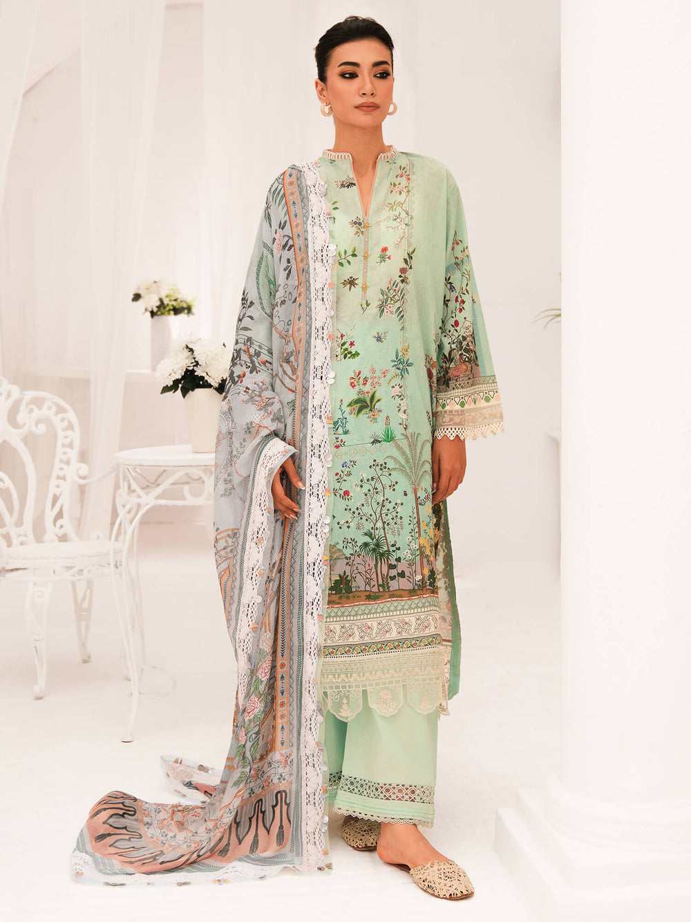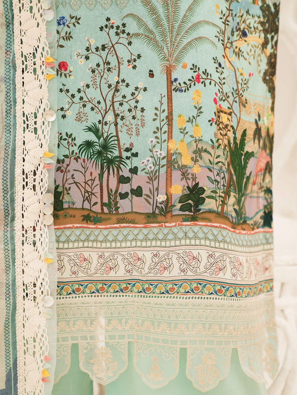 Inspired by chinoiserie florals, “Ankara” is composed on a sky blue printed canvas with elegantly detailed organza borders and is paired with a matching diaphanous silk dupatta. Sure to be favourite for all your summer soirees.