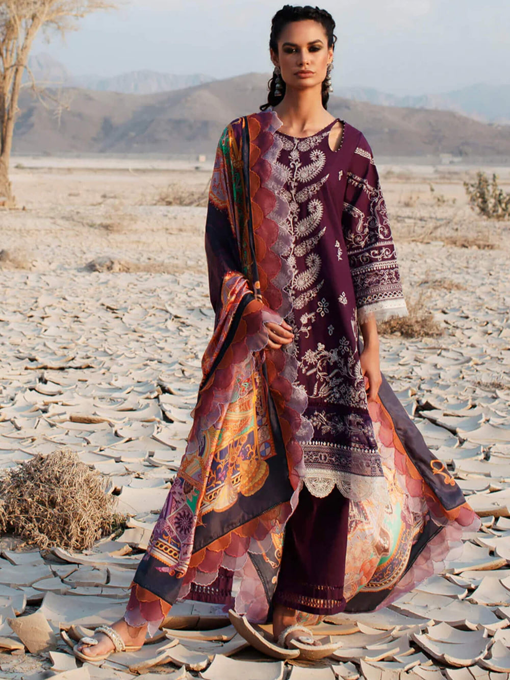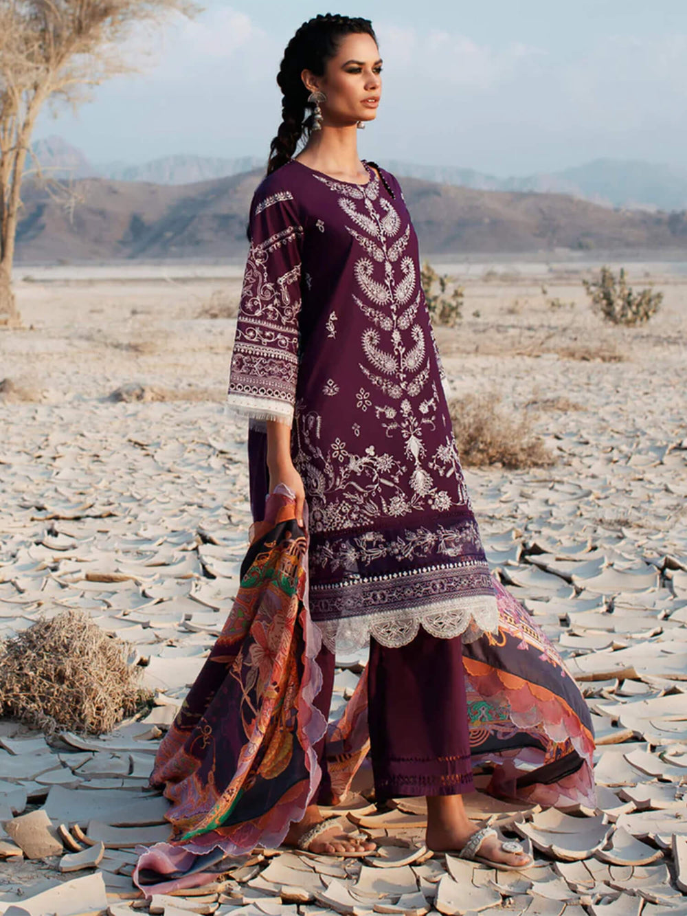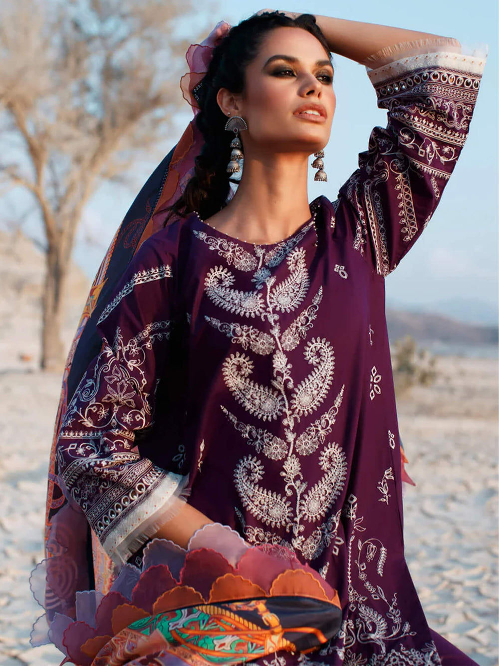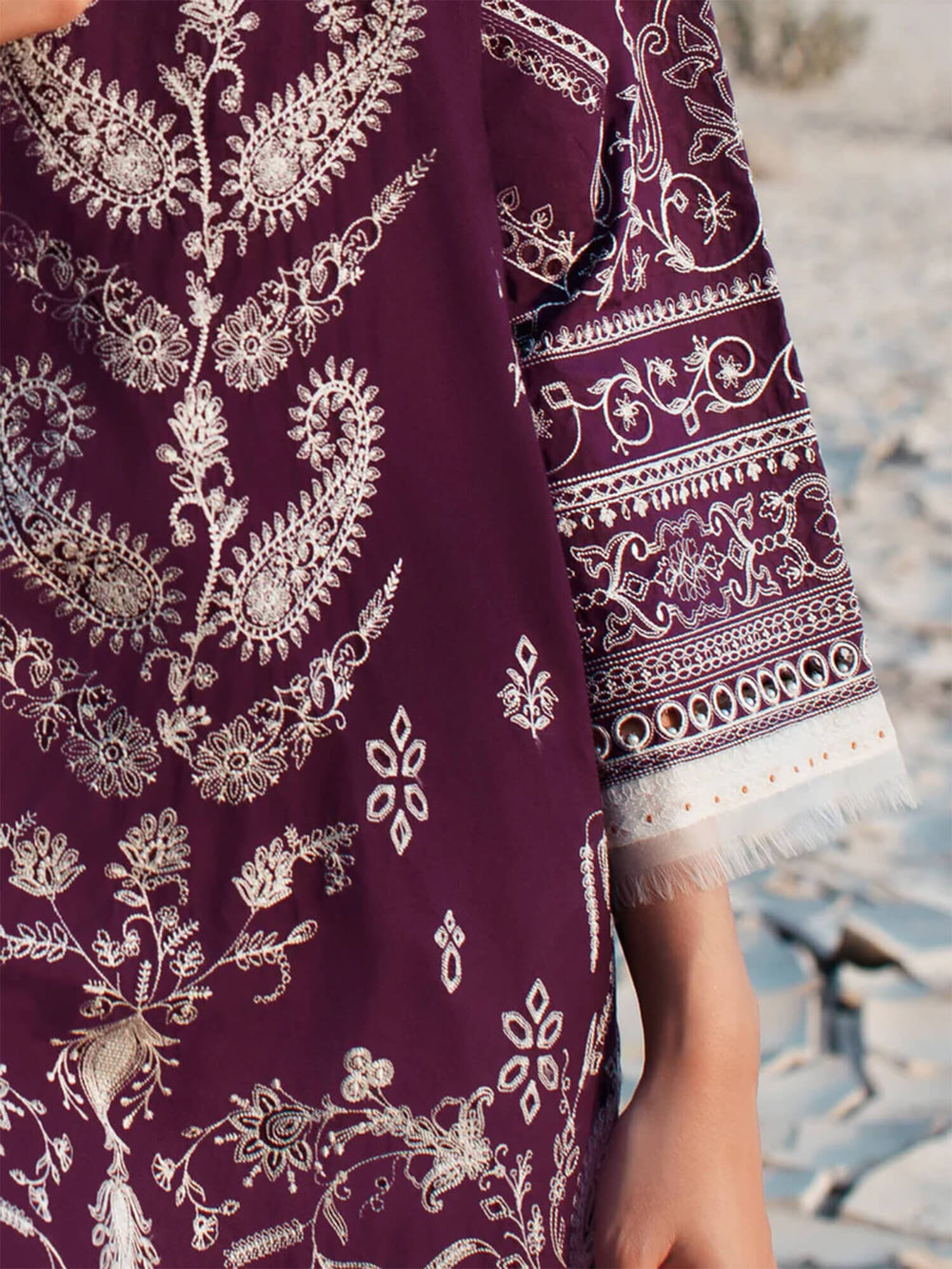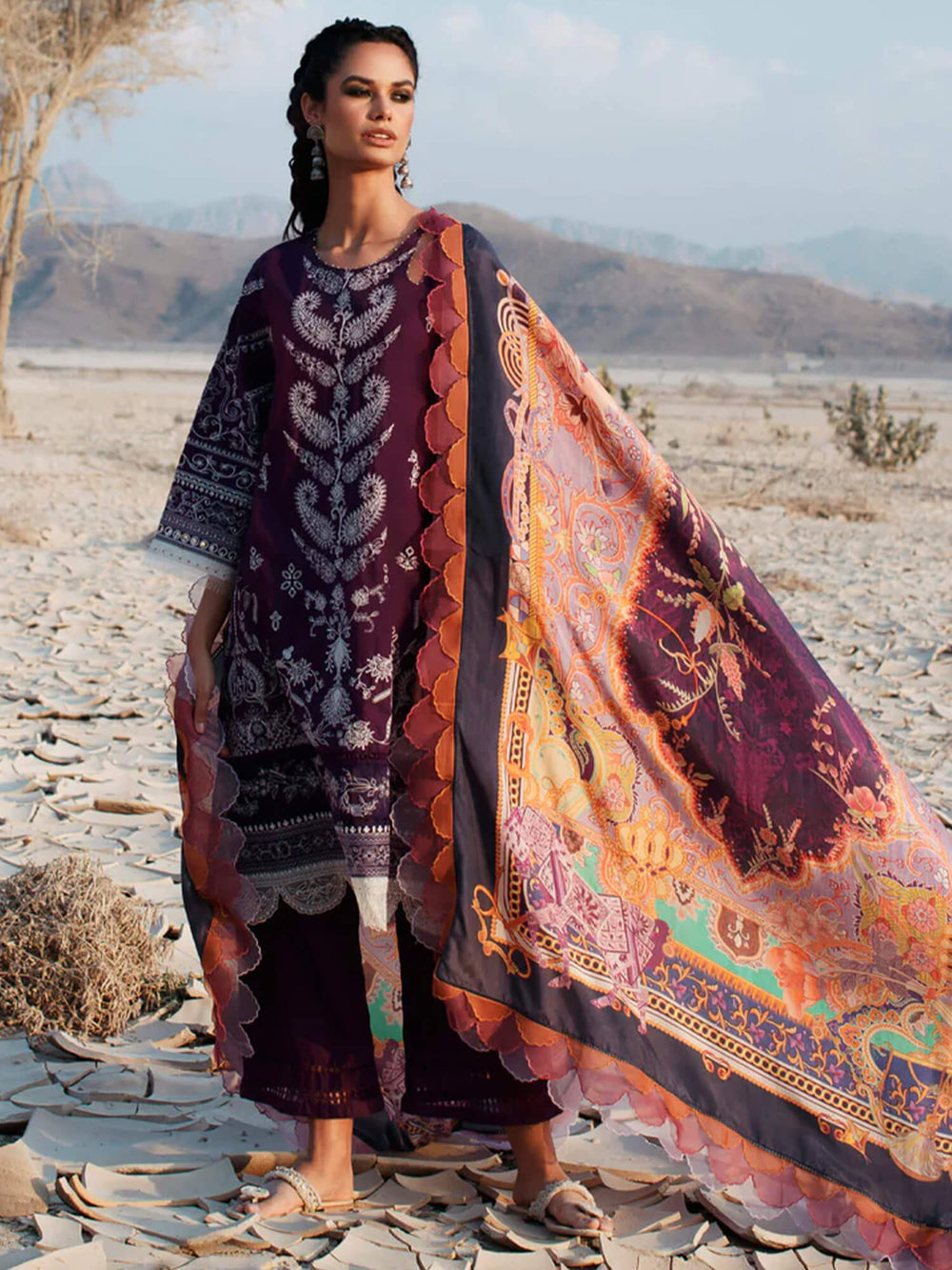 A beautiful symphony marrying Kashmiri stitches and Mughal paisley motifs on this deep aubergine pima lawn shirt with a digitally printed pure silk dupatta inspired by vintage Indo-European shawls and tapestries is sure to be a masterpiece keepsake for your springtime armoire.