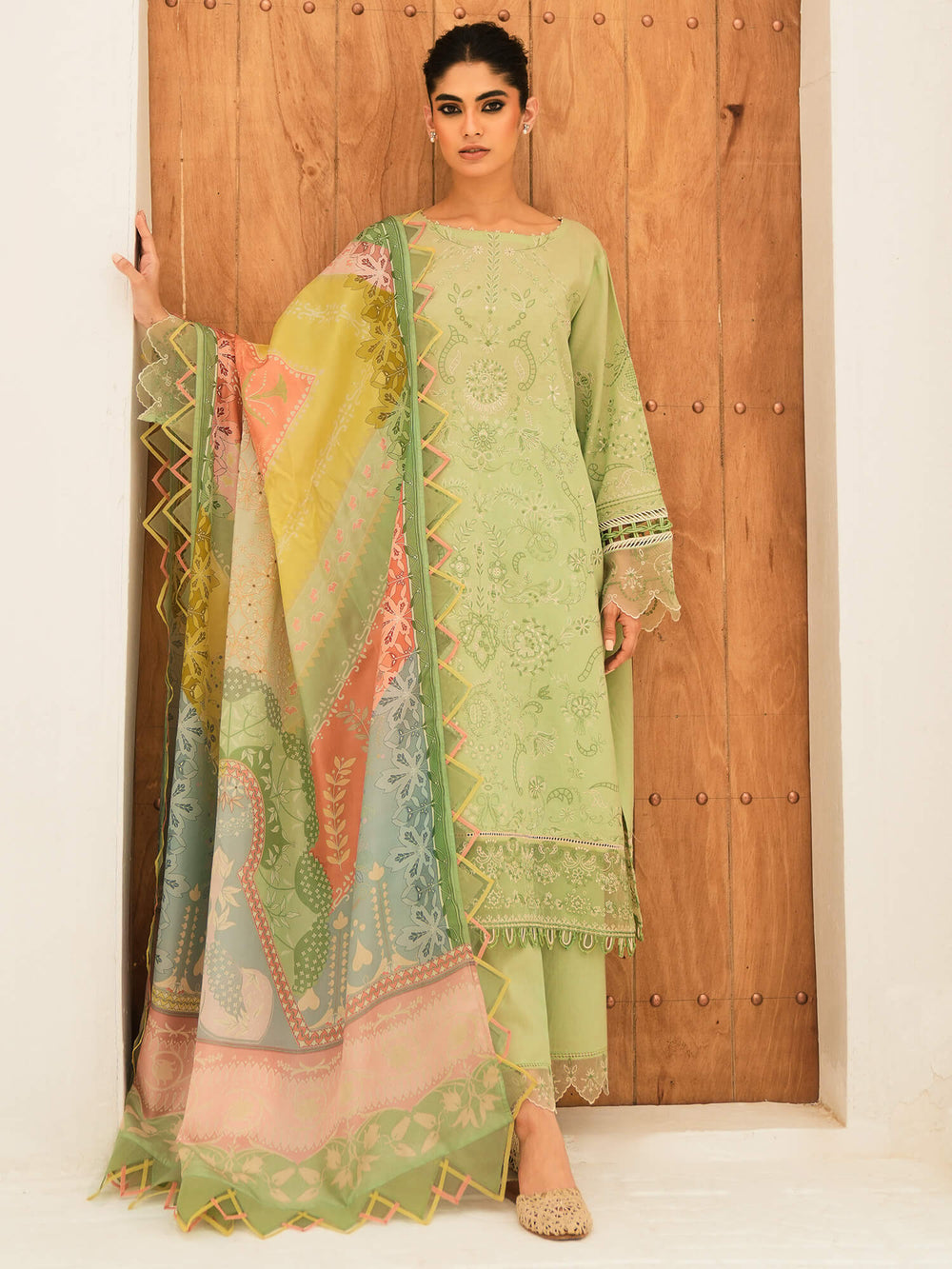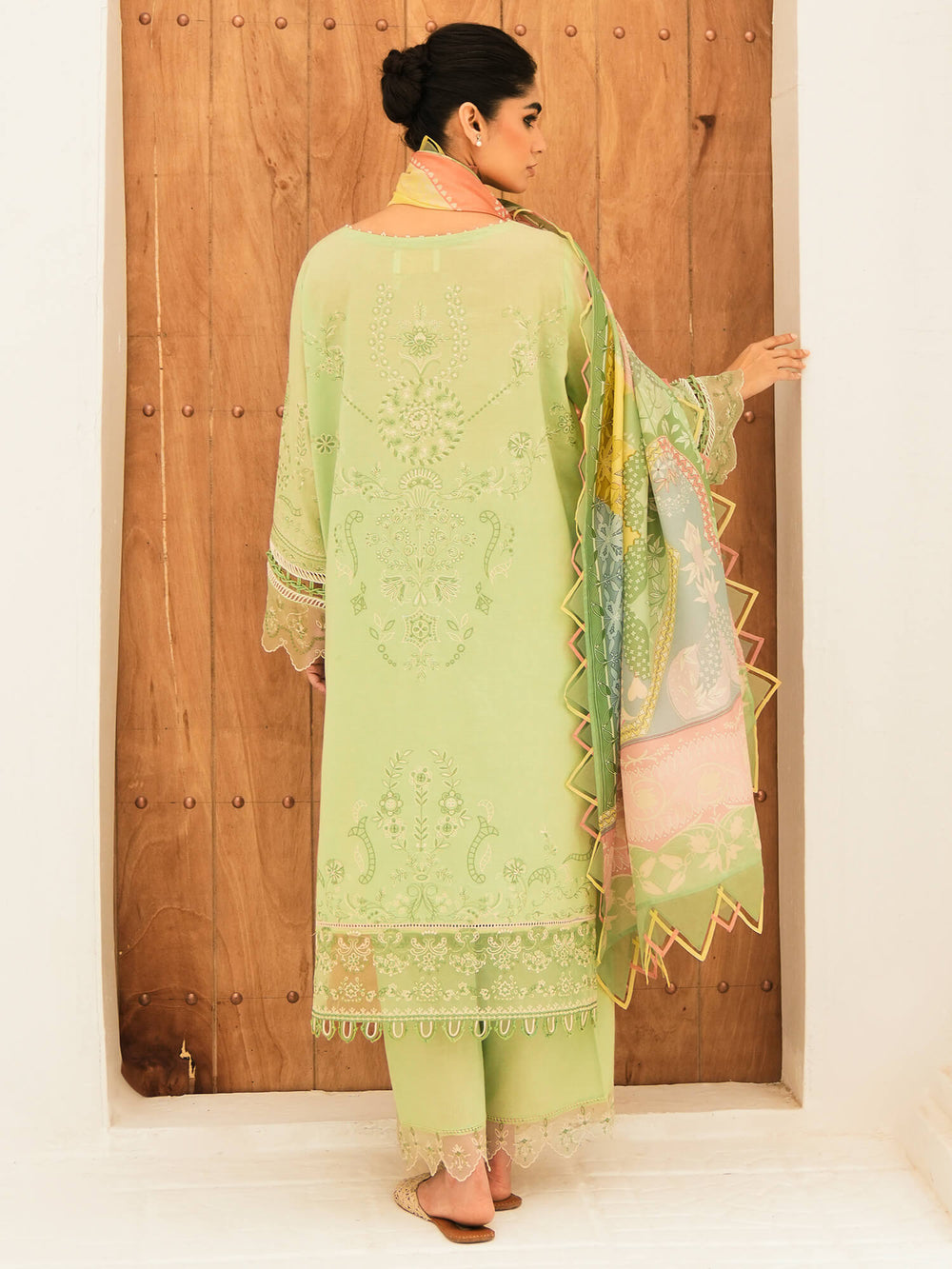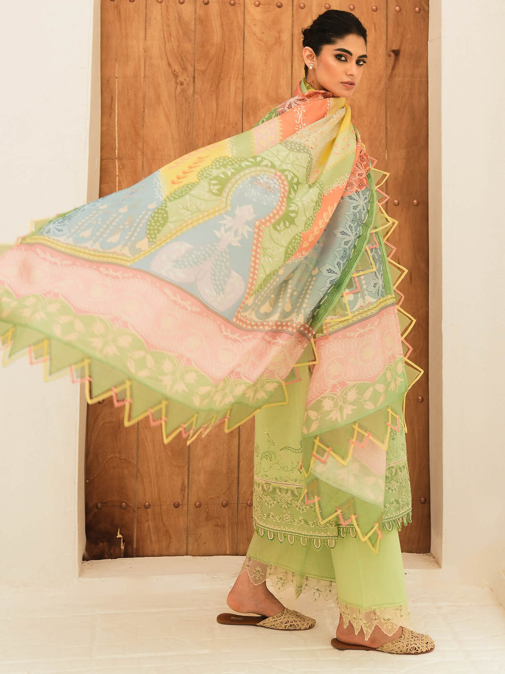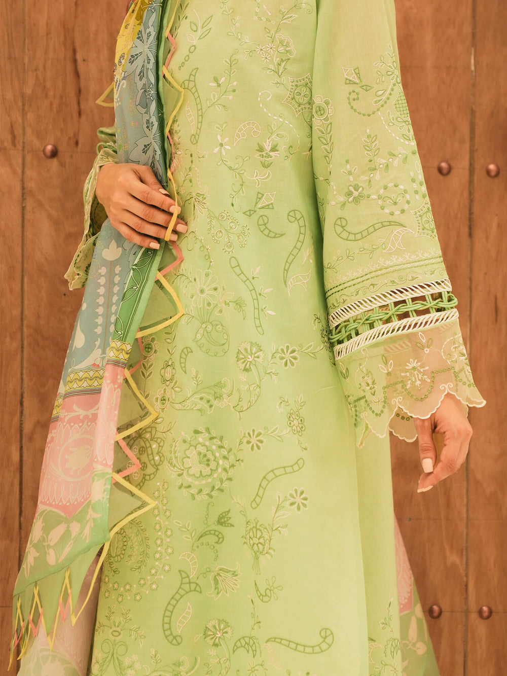 Our “Dahlia” is a must-have addition to your wardrobe. It comes in a delicate mint base with intricate embroidery and effortlessly elegant organza borders, and is paired with a colour blocked dupatta in complementing hues to elevate the look further.