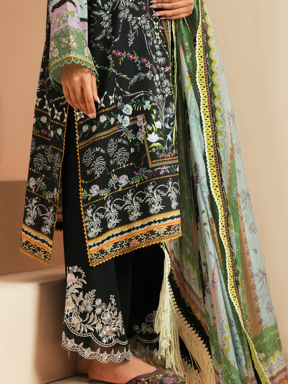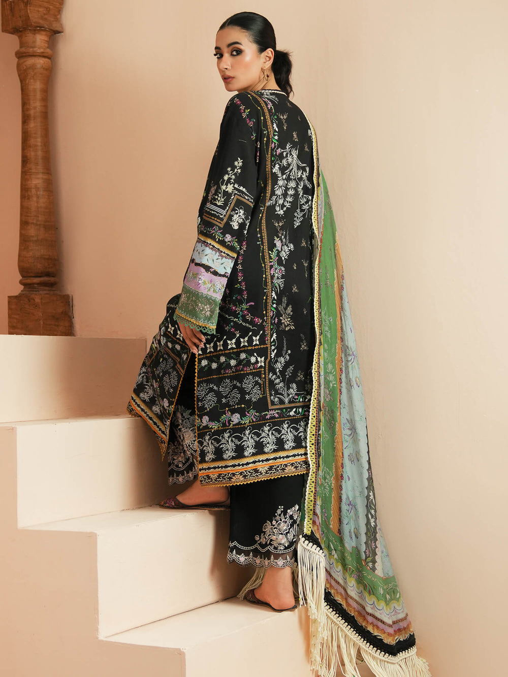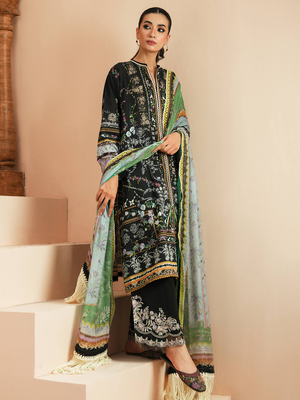 Inspired by the timeless garah motifs, “Farah” is composed on a black printed canvas and is paired with a matching pants with elegantly detailed organza borders and a spun-net dupatta in hues of blue, green and lilac. Sure to be favourite for all your summer soirees.