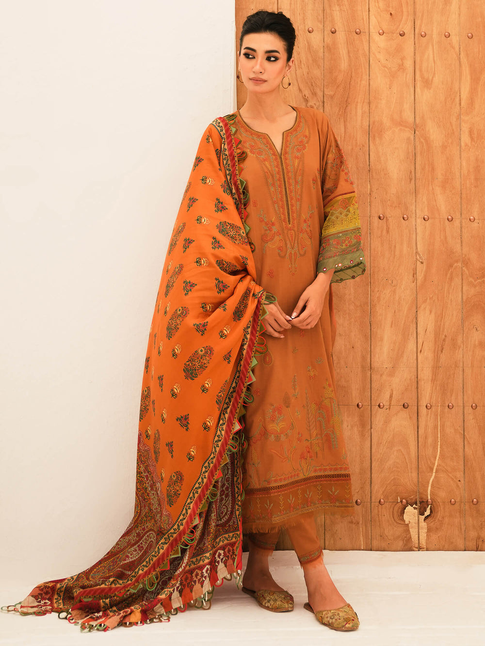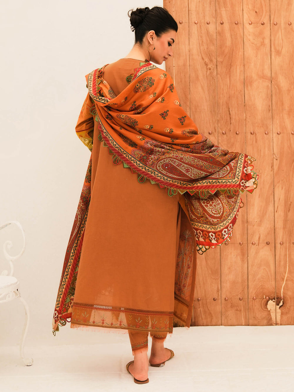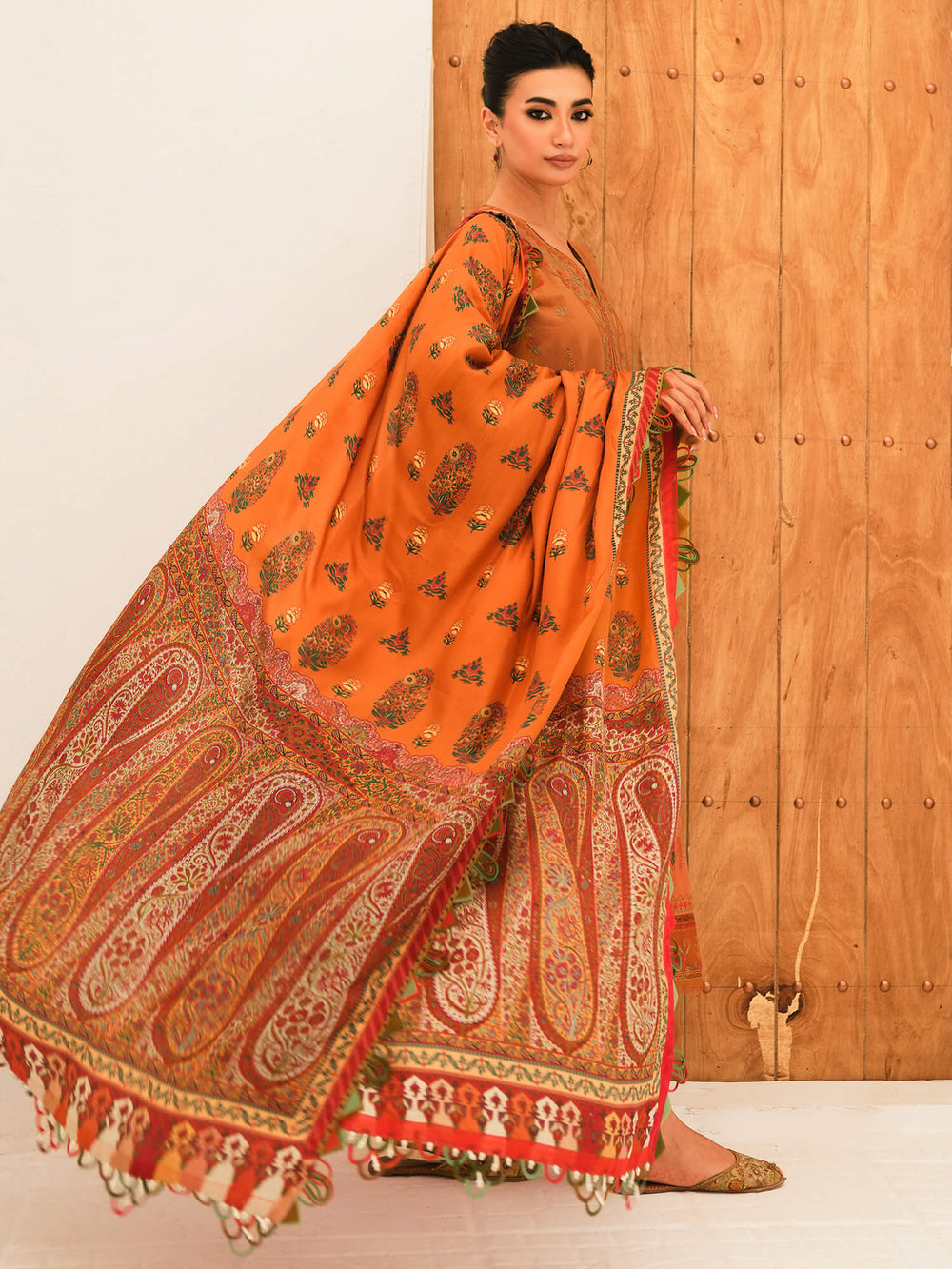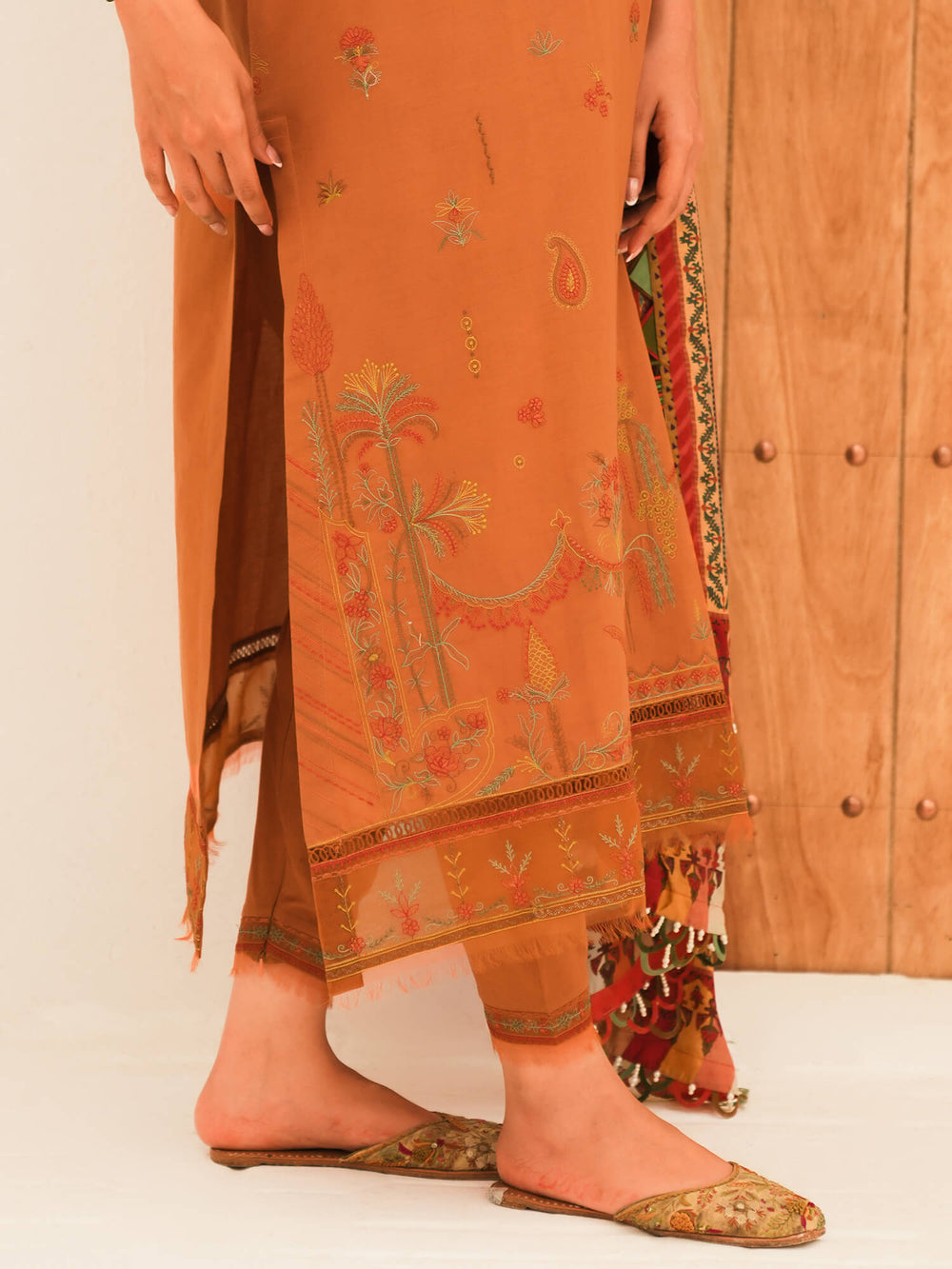 Inspired by Kashmiri paisleys, “Leiya” features fine embroidery on a rust base in contrasting hues of lime and jade. Paired with a beautiful silk dupatta and matching pants.