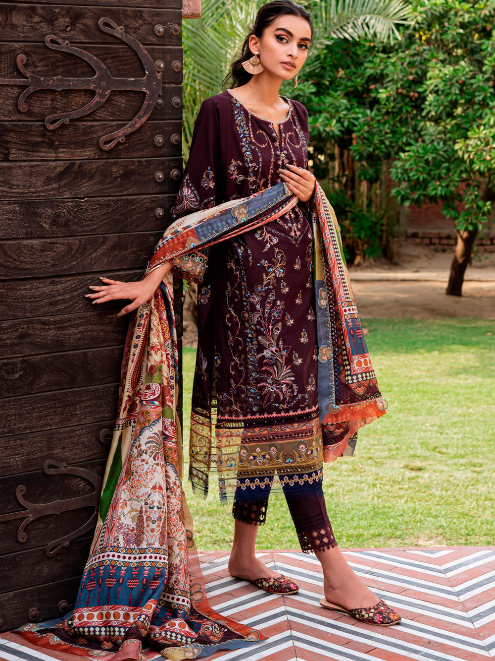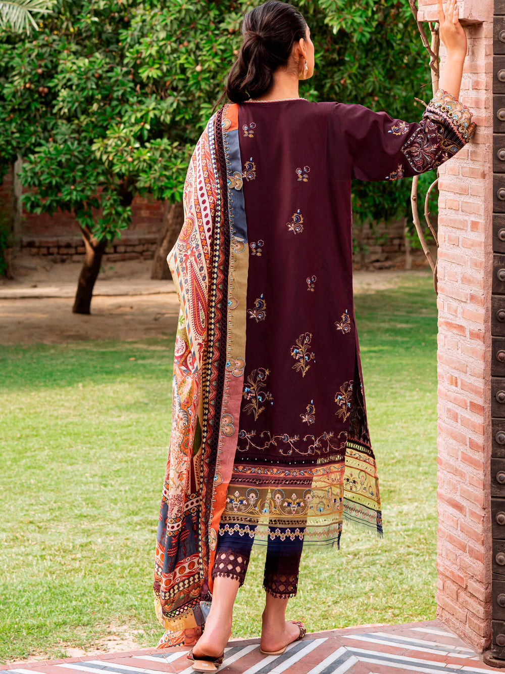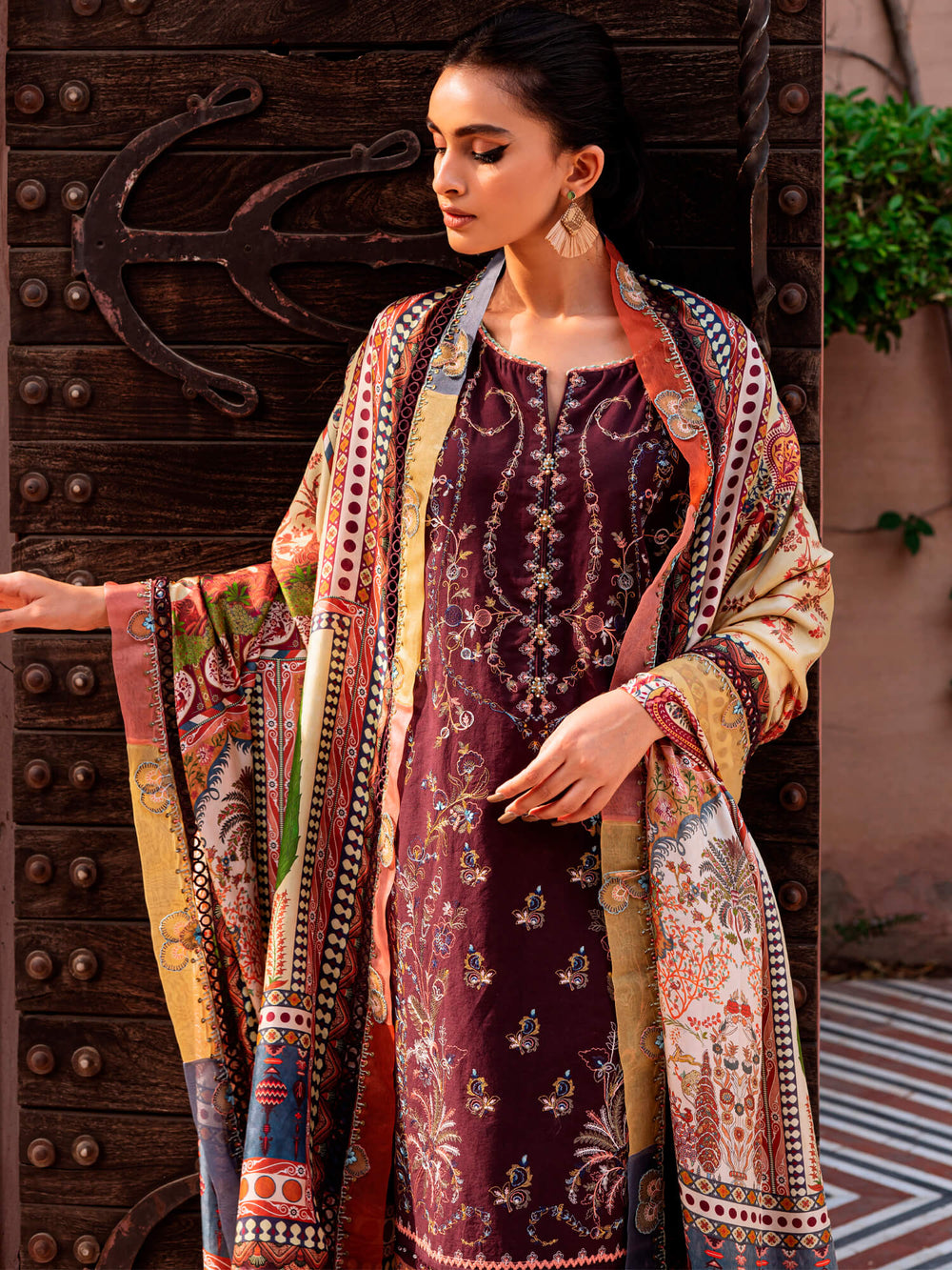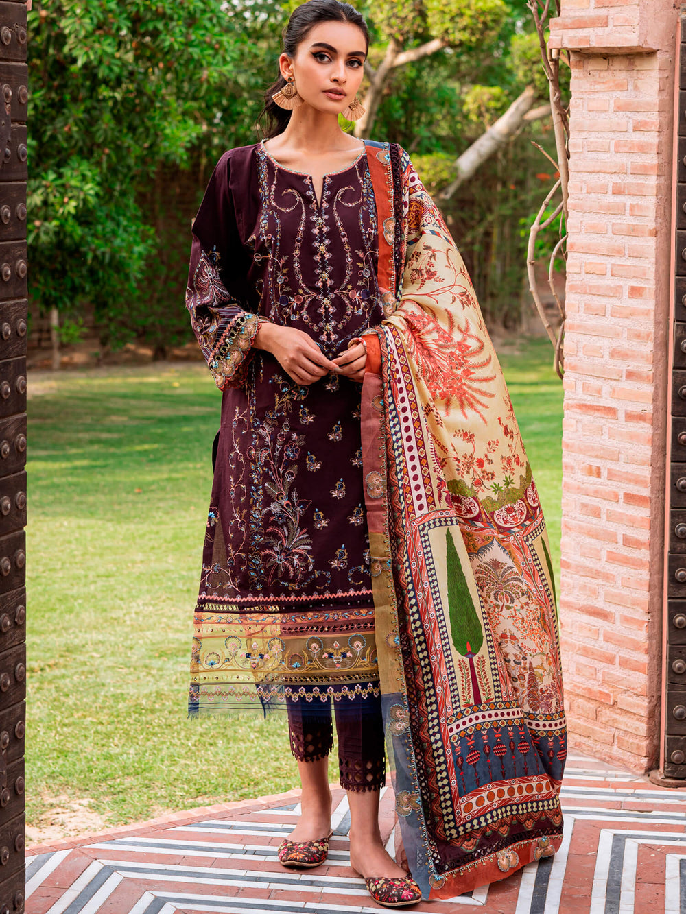 Crafted on a plum base, “Uzma” features contrasting multi-coloured embroidery set against a printed silk dupatta with nature-inspired prints including a palm trees, foliage and pine cones and matching pants.