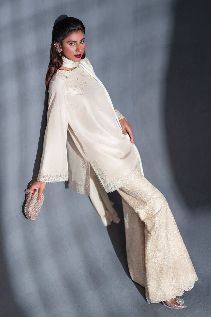 Rendered in a pristine white, this kameez features a boat neckline embroidered with blossoms resembling sprays of baby’s breath, while fine lace borders trace the hem and slits. Long, flared trousers are brought to life with lush paisley embroidery that extends to their generous cuffs. The silk dupatta, enveloping you like snow, is bordered with delicate trims that catch the light, completing a composition as radiant as a sunny winter's day.