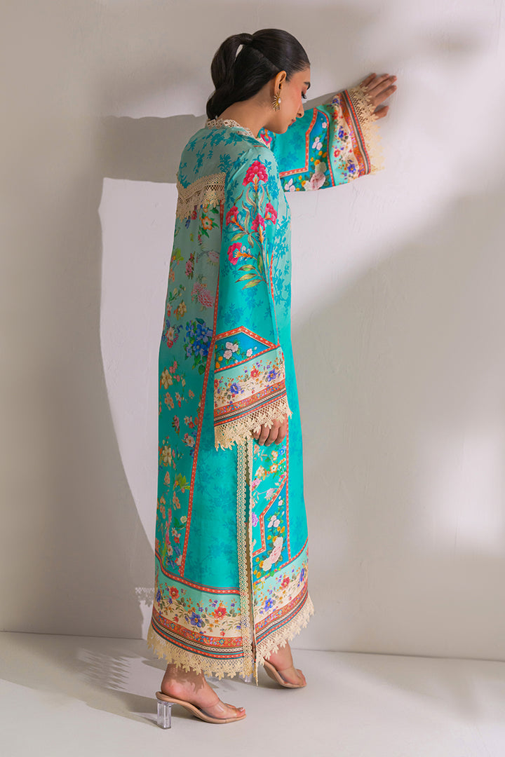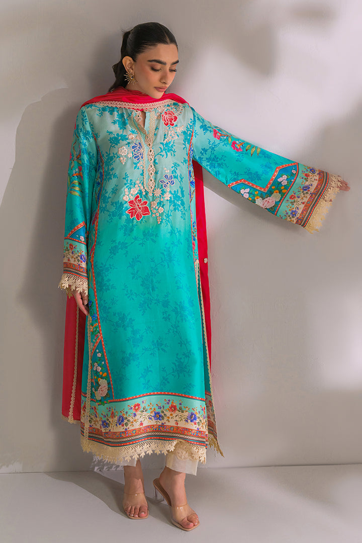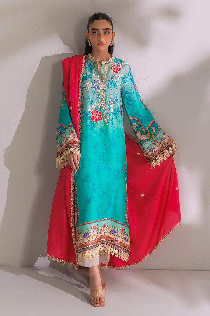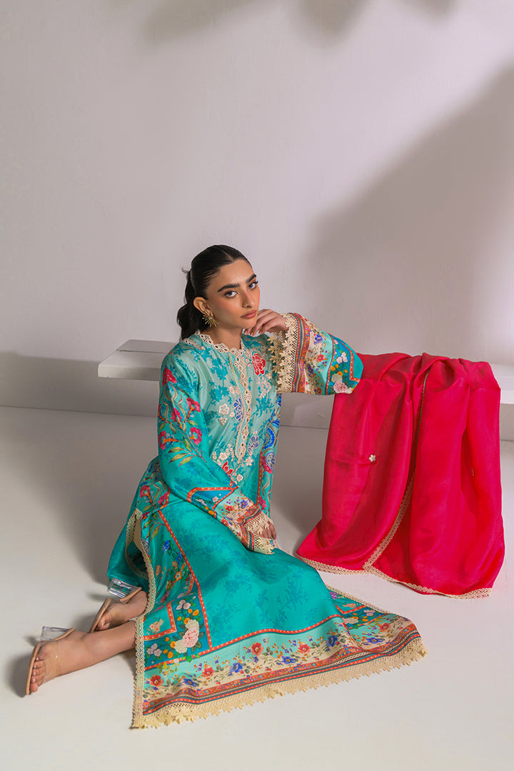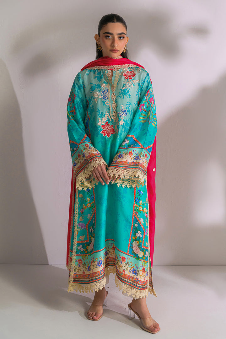Step into the spotlight with Aida - a universally appealing silhouette in a shaded turqoise palette rendered with eye catching floral applique & cutwork along the neckline. It is beautifully finished with laces along the sleeves and daman. Throw in a poppy pink silk dupatta with some bling and heels and be sure to have heads turn in this graceful yet glamourous look!