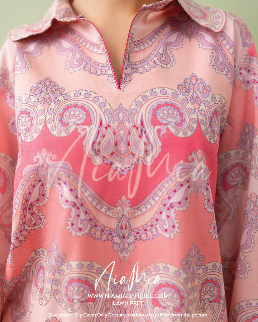 A two-piece printed set in soft shades of pink with delicate tonal motifs. The collared neckline adds a tailored touch, while cutwork embroidery details the sleeves and shirt hem. Paired with a flowing farshi shalwar for an elegant yet relaxed summer look.