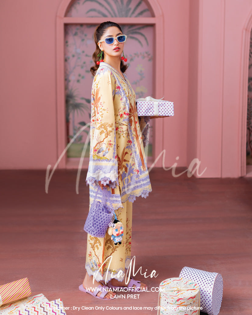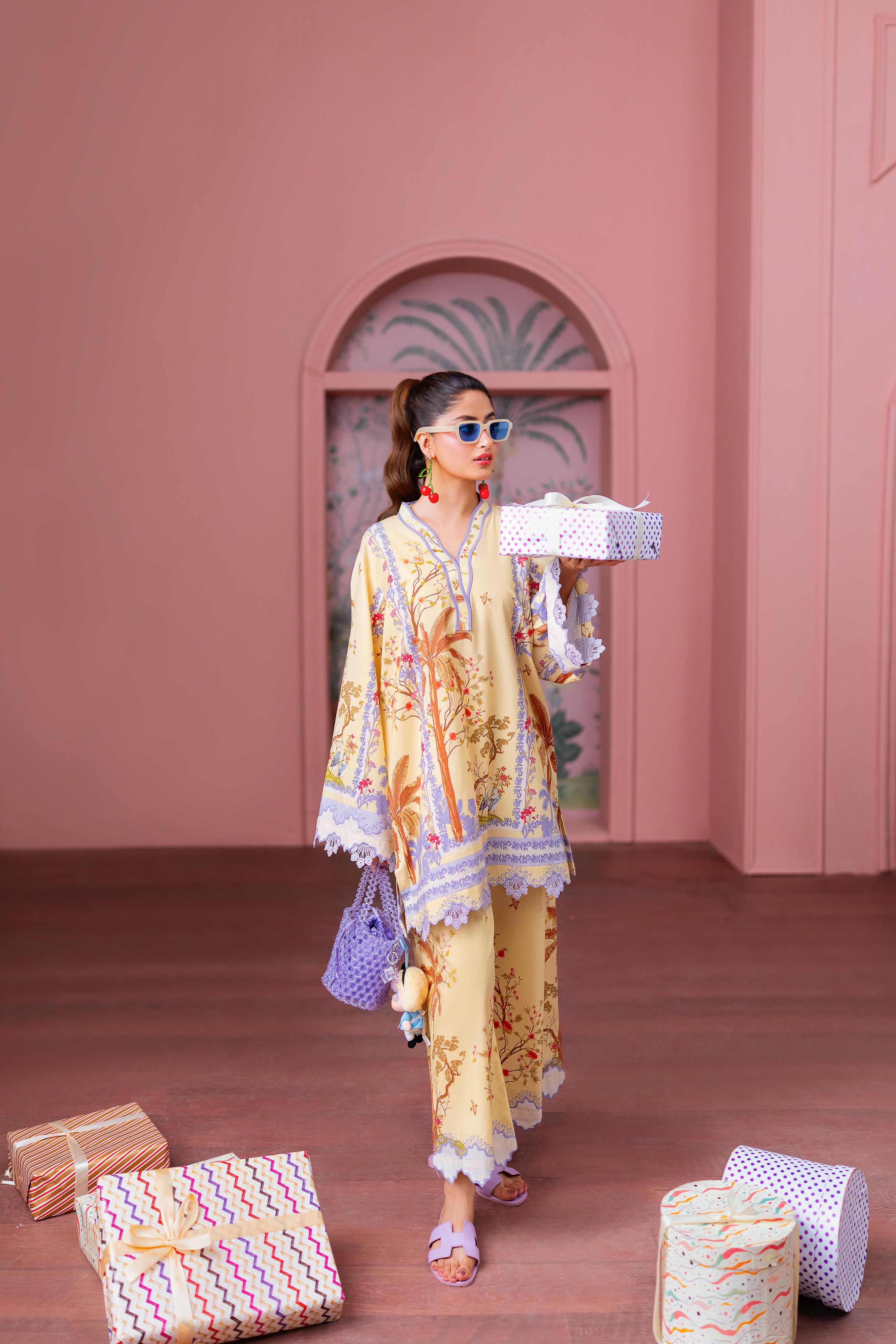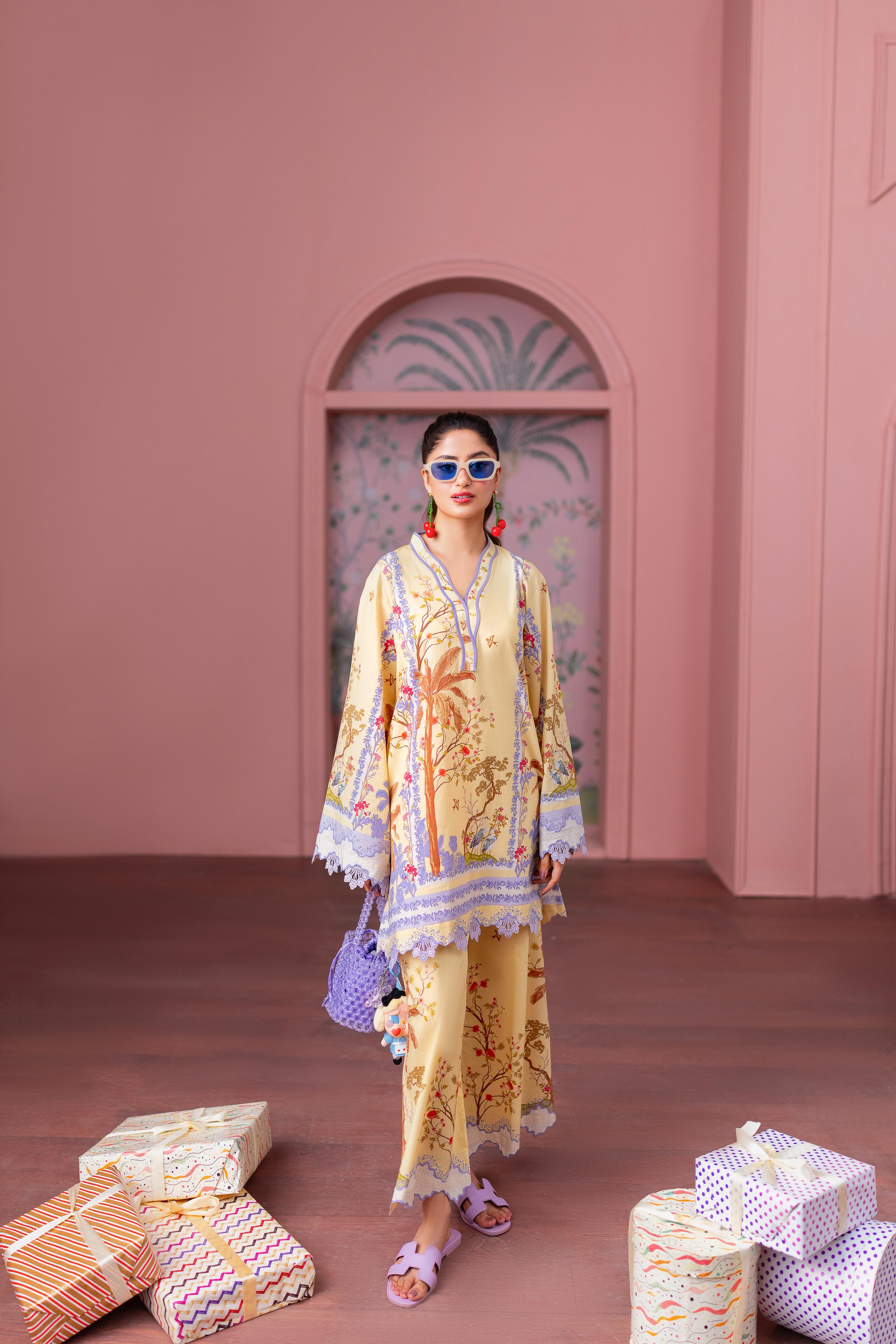 A two-piece printed set in a warm yellow base, lifted with soft lilac floral motifs. The neckline features a gentle V-cut framed with tonal embroidery, while airy cutwork details finish the sleeves. Paired with a matching printed izaar for an effortlessly cheerful summer look.