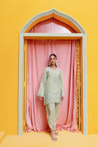 A two-piece printed set in refreshing green, patterned with white and black motifs. The soft round neckline is embellished with beads, adding a subtle shimmer, while scalloped cutwork embroidery accents the sleeves and hem. Paired with a matching printed balloon shalwar for an effortlessly fresh summer look.