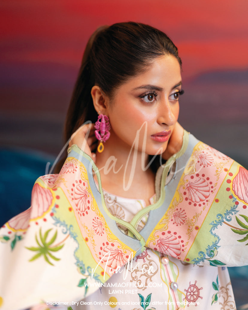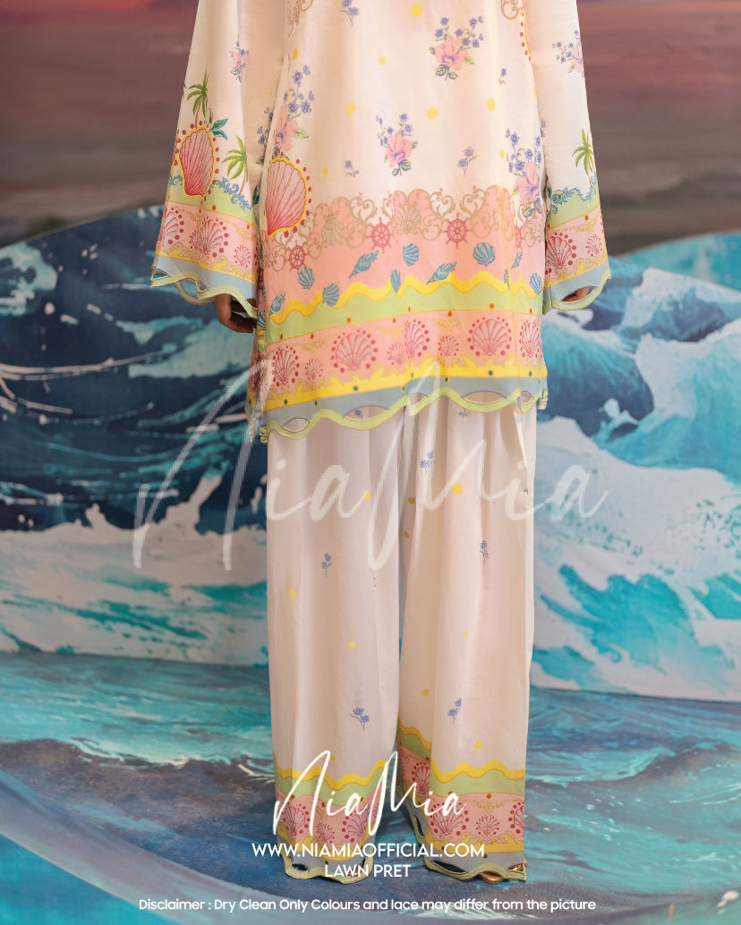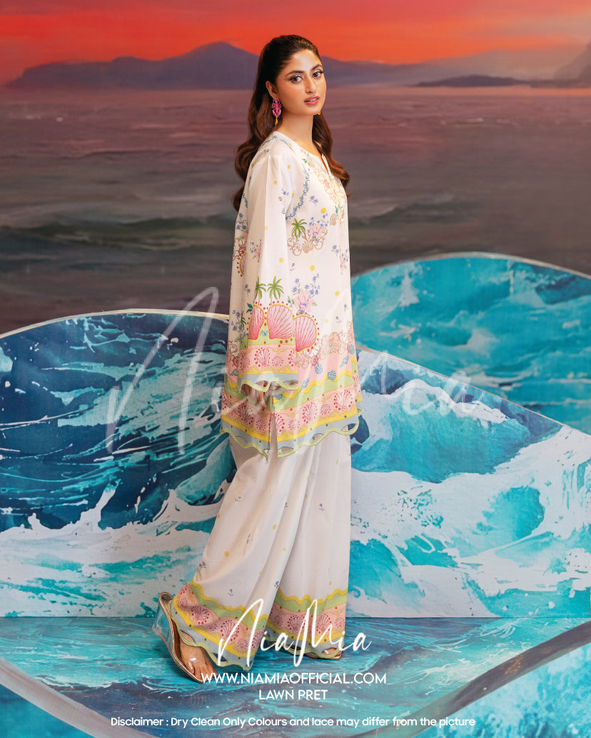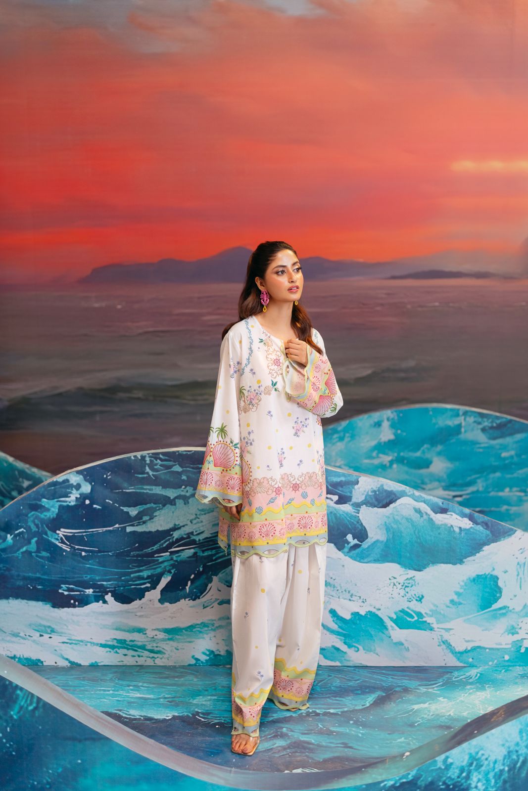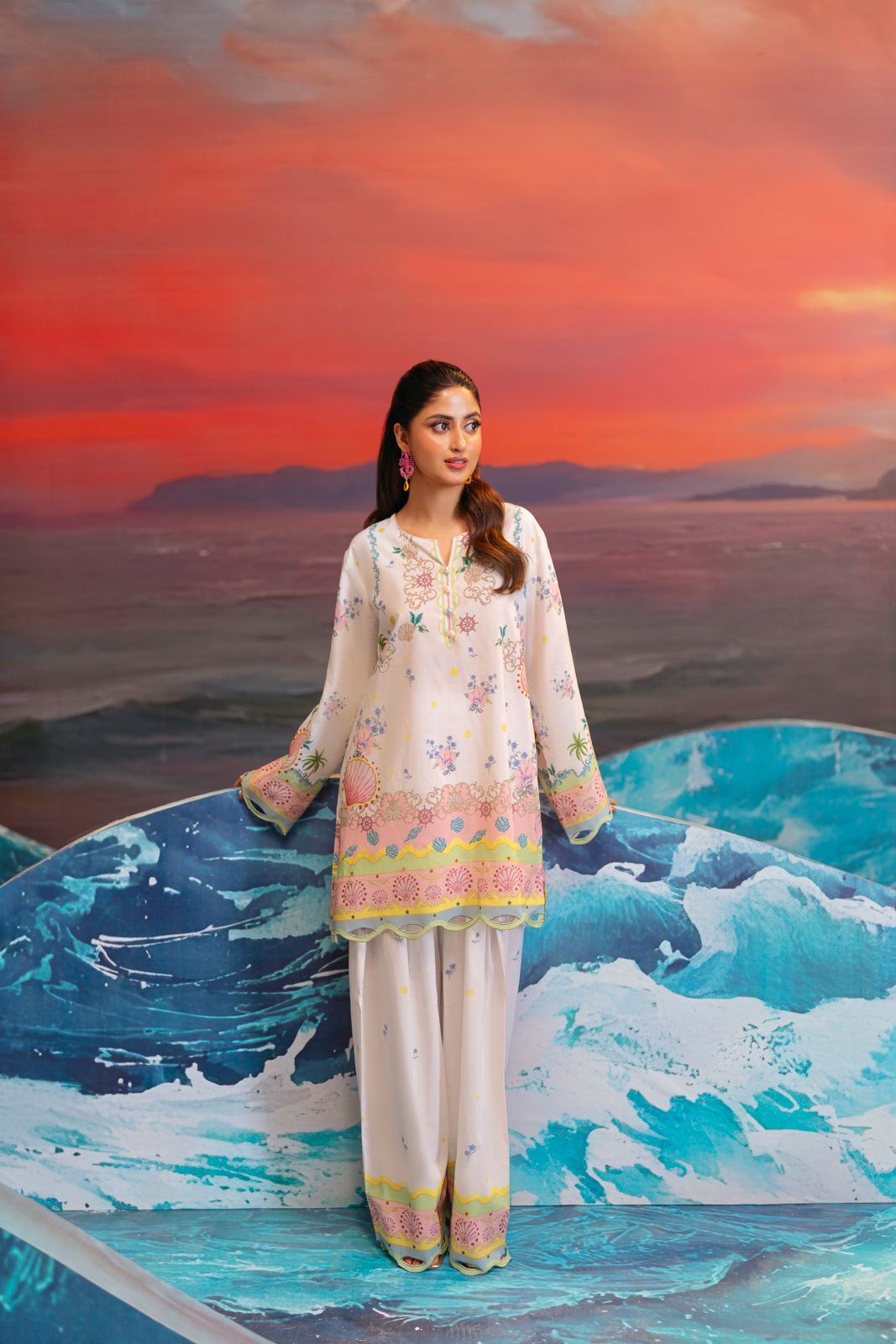 A two-piece printed set on a fresh white base, brought to life with soft blue, green, and pink motifs. The straight silhouette features cutwork embroidery along the shirt hem and sleeves, with matching cutwork accents on the shalwar hem for a perfectly coordinated finish. A breezy yet polished choice for warm days.