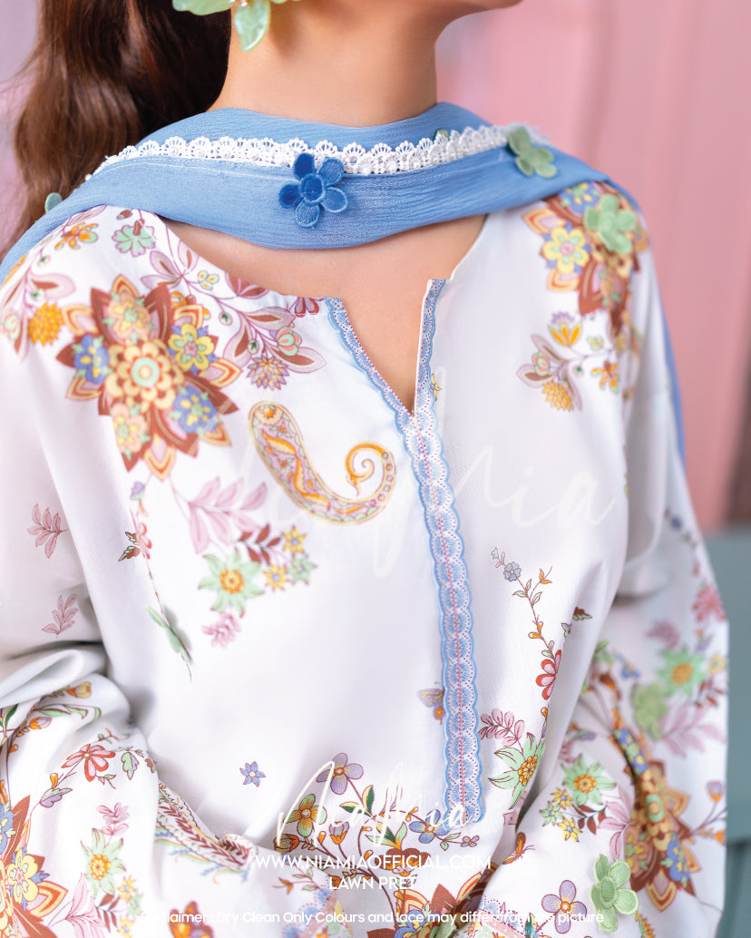 A two-piece printed set on a crisp white base, adorned with vibrant multicolour motifs and delicate 3D flowers. The neckline is kept clean, while the hem, sleeves, and farshi shalwar are finished with matching lace for a cohesive, detailed look. Paired with a contrasting blue dupatta for a playful yet refined summer outfit.