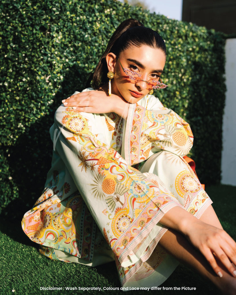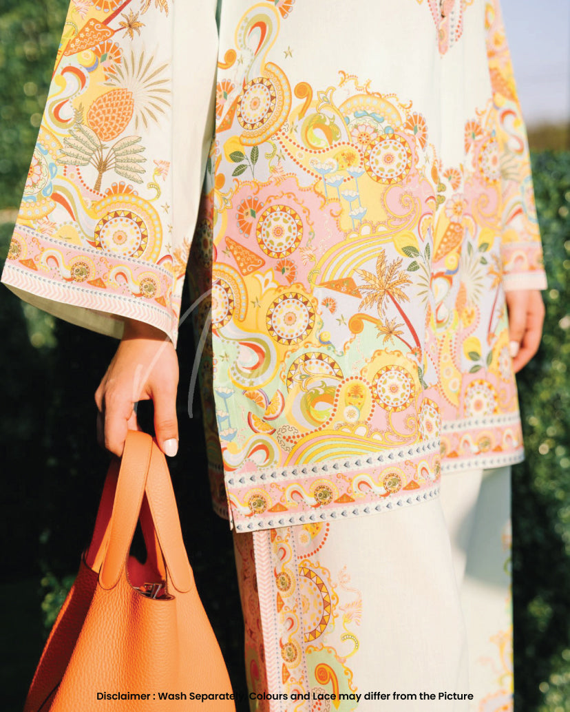 Introducing ‘Arcade’ from our Lawn Vol 1 2025 collection – a refined two-piece set that embodies timeless elegance. The ensemble features a straight kumeez adorned with a striking arcade-inspired motif, paired with a mint culotte izaar detailed with a vibrant print along the borders. In a harmonious blend of mint and colorful hues, this set offers a perfect balance of sophistication and lively charm, making it an essential addition to your wardrobe this season.