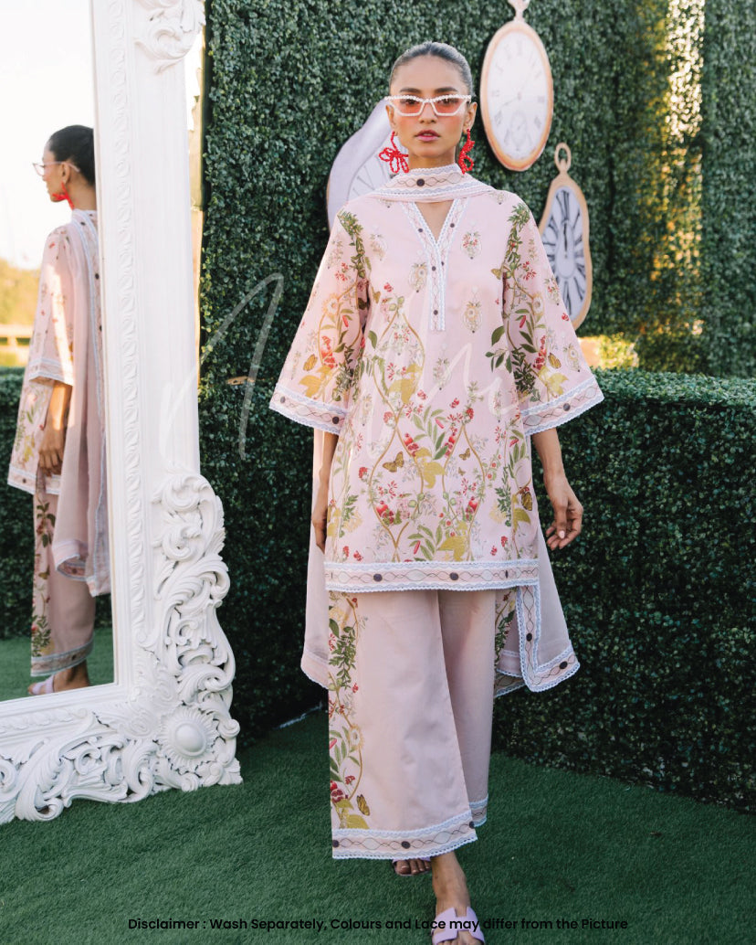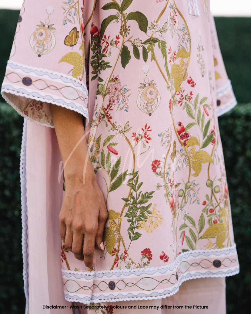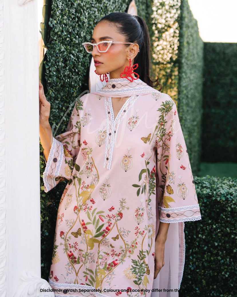 Introducing ‘Grenada’ from our Lawn Vol 1 2025 collection – a truly stunning creation! This beautifully crafted outfit features a delicate print of butterflies, leaves, and pomegranates on premium prima lawn, finished with intricate lace for that perfect touch of elegance. The straight kameez and chic culottes combine to create a modern yet timeless look. The 2.5-yard dupatta, in soft pink hues, is delicately framed with a border and lace detailing, completing the ensemble with a graceful, feminine finish.