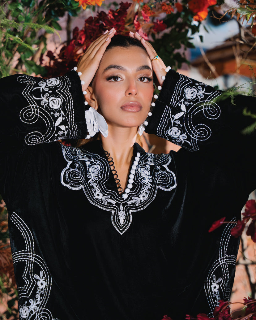 The Vino B designed in a classic short kumeez is a part of the Winter Edit’24. This set includes our loose-fitting kameez cut from Velvet, adorned with intricate white coloured embroidery on the shirt, and includes our signature skinny shalwar all cut from locally sourced velvet.