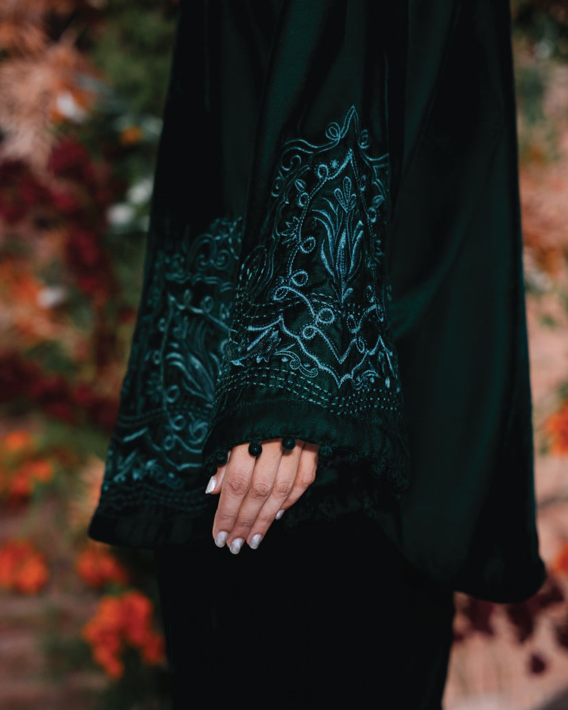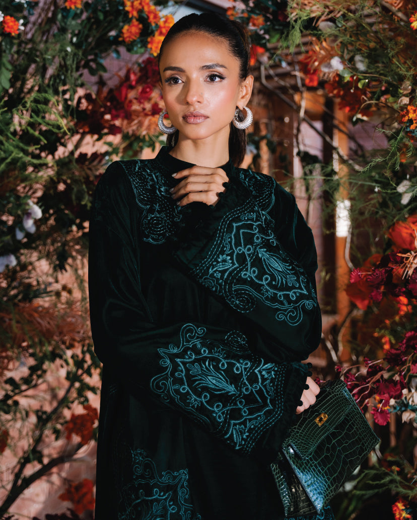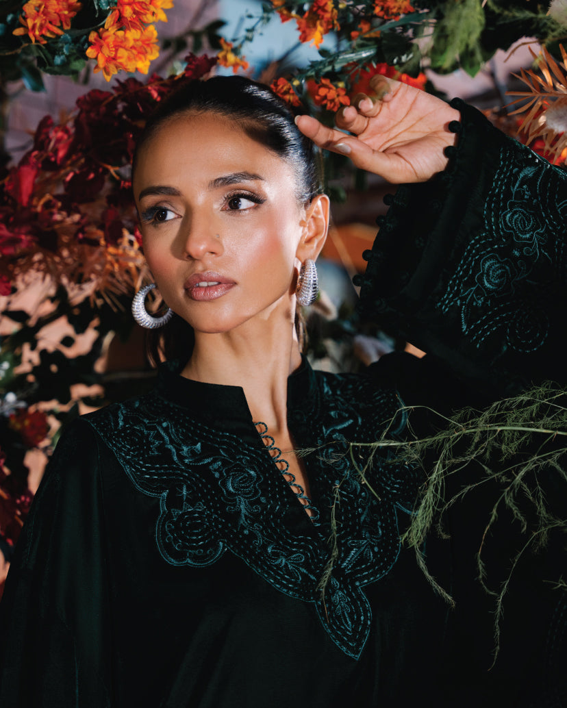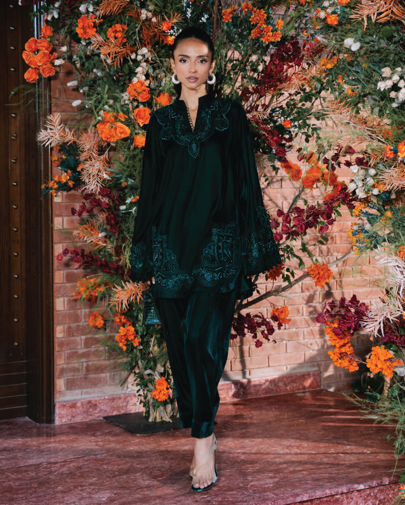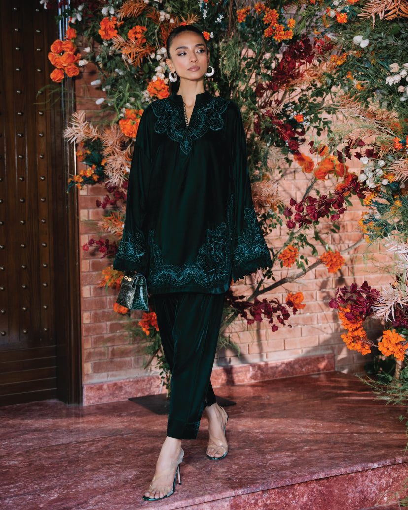 The Vino G designed in a classic short kumeez is a part of the Winter Edit’24. This set includes our loose-fitting kameez cut from Velvet, adorned with intricate self coloured embroidery on the shirt, and includes our signature skinny shalwar all cut from locally sourced velvet.