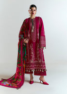 A striking fusion of tradition and elegance, this crimson red embroidered lawn ensemble is crafted to captivate. The shirt features detailed threadwork in silver and beige, inspired by classic Mughal patterns, with ornate embroidery on the neckline, sleeves, and borders. Finishing touches and intricate motifs elevate its festive appeal. Paired with a digitally printed silk dupatta, the look is completed with a vibrant splash of floral and abstract art, adding modern flair to the traditional silhouette. Ideal for festive occasions, this design blends timeless craftsmanship with contemporary charm.